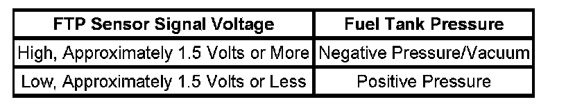 The table illustrates the relationship between the FTP sensor signal voltage and the EVAP system pressure/vacuum.