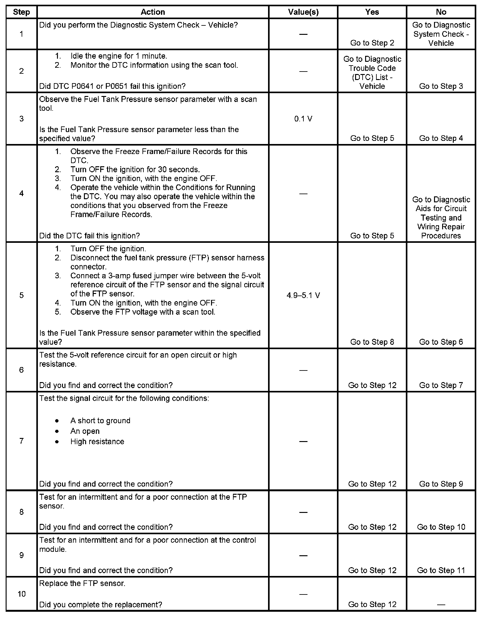 The fuel tank pressure (FTP) sensor measures the difference between the air pressure or vacuum in the evaporative emission (EVAP) system, and the outside air pressure. The control module supplies a 5-volt reference and a low reference circuit to the FTP sensor. The FTP sensor signal circuit voltage varies depending on EVAP system pressure or vacuum. If the FTP sensor signal voltage goes below a calibrated value, this DTC sets.