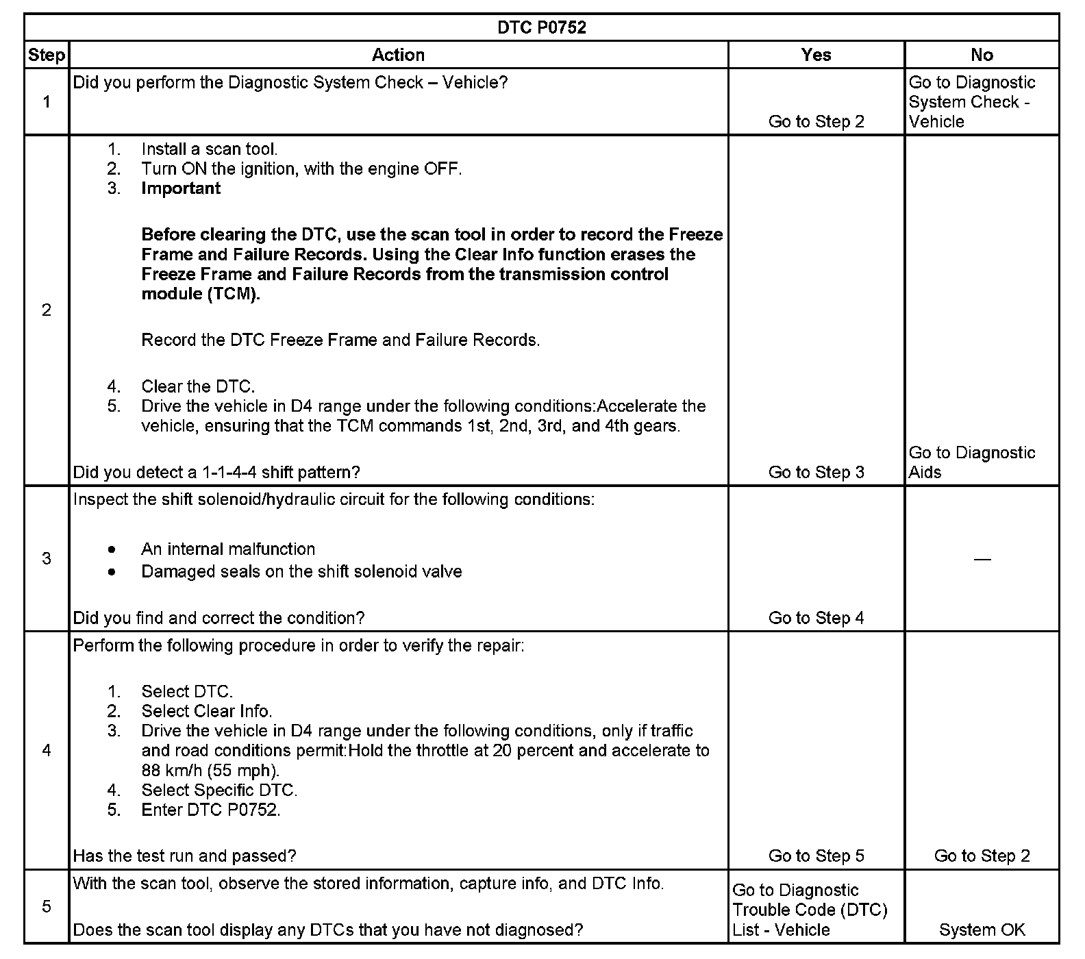 When the transmission control module (TCM) detects a 1-1-4-4 shift pattern, then DTC P0752 sets. DTC P0752 is a type B DTC.