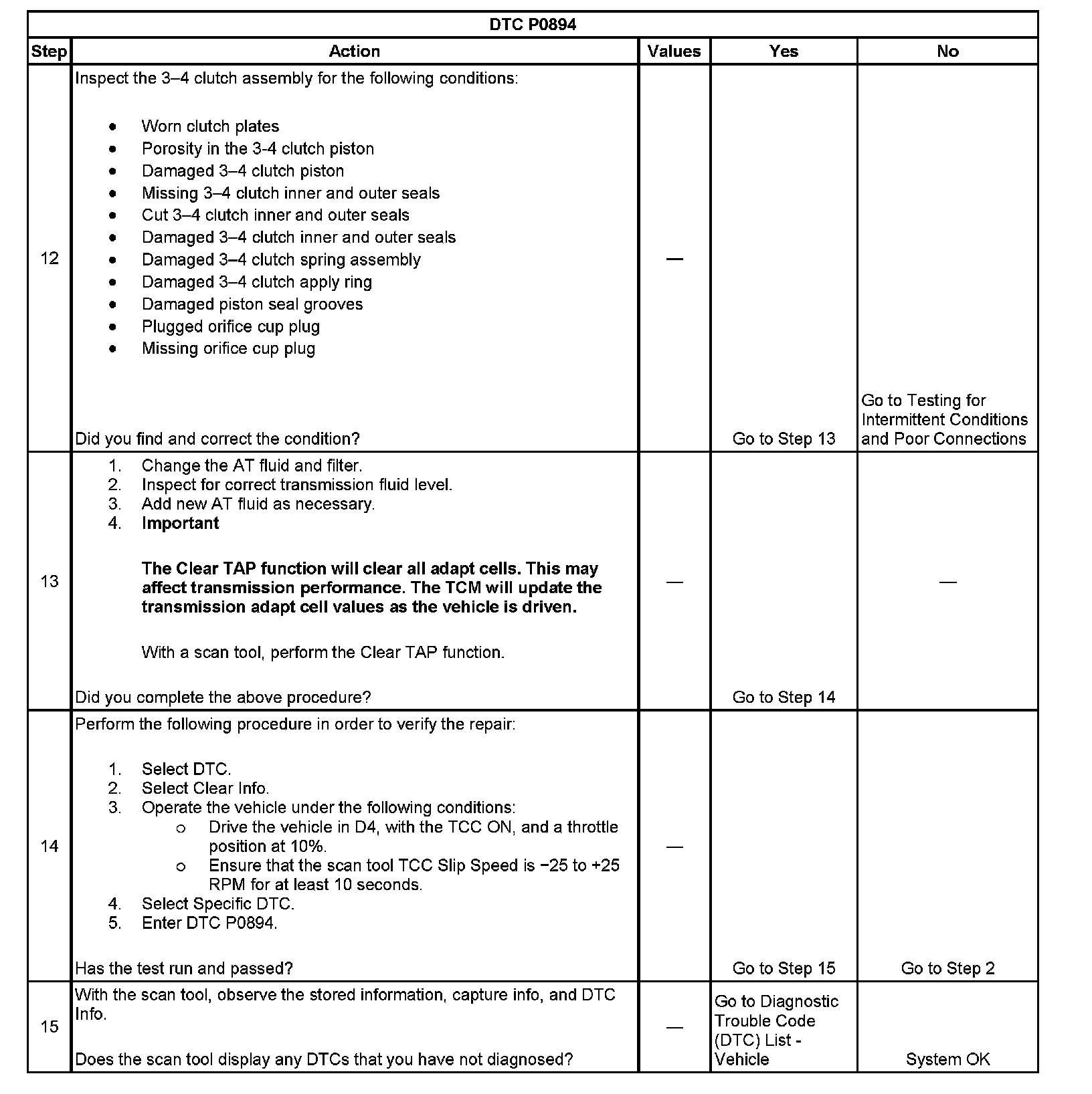 When the TCM detects excessive TCC slip when the TCC should be engaged, then DTC P0894 sets. DTC P0894 is a type B DTC.