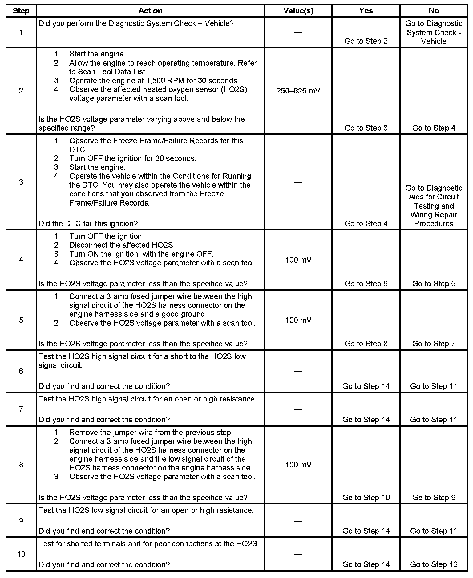Heated oxygen sensors (HO2S) are used for fuel control and post catalyst monitoring. Each HO2S compares the oxygen content of the surrounding air with the oxygen content in the exhaust stream. The HO2S must reach operating temperature to provide an accurate voltage signal. Heating elements inside the HO2S minimize the time required for the sensors to reach operating temperature. The engine control module (ECM) supplies the HO2S with a reference, or bias, voltage of about 450 mV. When the engine is first started the ECM operates in Open Loop, ignoring the HO2S voltage signal. Once the HO2S reaches operating temperature and Closed Loop is achieved, the HO2S generates a voltage within a range of 0-1,000 mV that fluctuates above and below bias voltage. High HO2S voltage indicates a rich exhaust stream. Low HO2S voltage indicates a lean exhaust stream. This diagnostic will only run once per ignition cycle. The ECM monitors the number of rich-to-lean and lean-to-rich transitions. If the ECM detects that the number of transitions were less than a specified value, DTC P1133 sets for HO2S bank 1 sensor 1, or DTC P1153 sets for HO2S bank 2 sensor 1.