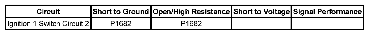 There are 2 ignition 1 voltage circuits supplied to the engine control module (ECM). The first ignition 1 voltage circuit is provided by the powertrain relay, through the TAC fuse, located in the underhood fuse block. This ignition 1 voltage circuit supplies power to all the internal ECM circuits associated with the throttle actuator control (TAC) operation, and to both TAC motor control circuits to the throttle body. The ignition switch provides the second ignition 1 voltage circuit to the ECM, through the ECM 1 fuse located in the underhood fuse block. This ignition 1 voltage provides power to all internal ECM circuits, except those associated with TAC operation. The ECM continuously monitors both ignition 1 voltage circuits. If the ECM detects a voltage level difference between the two circuits, DTC P1682 will set.