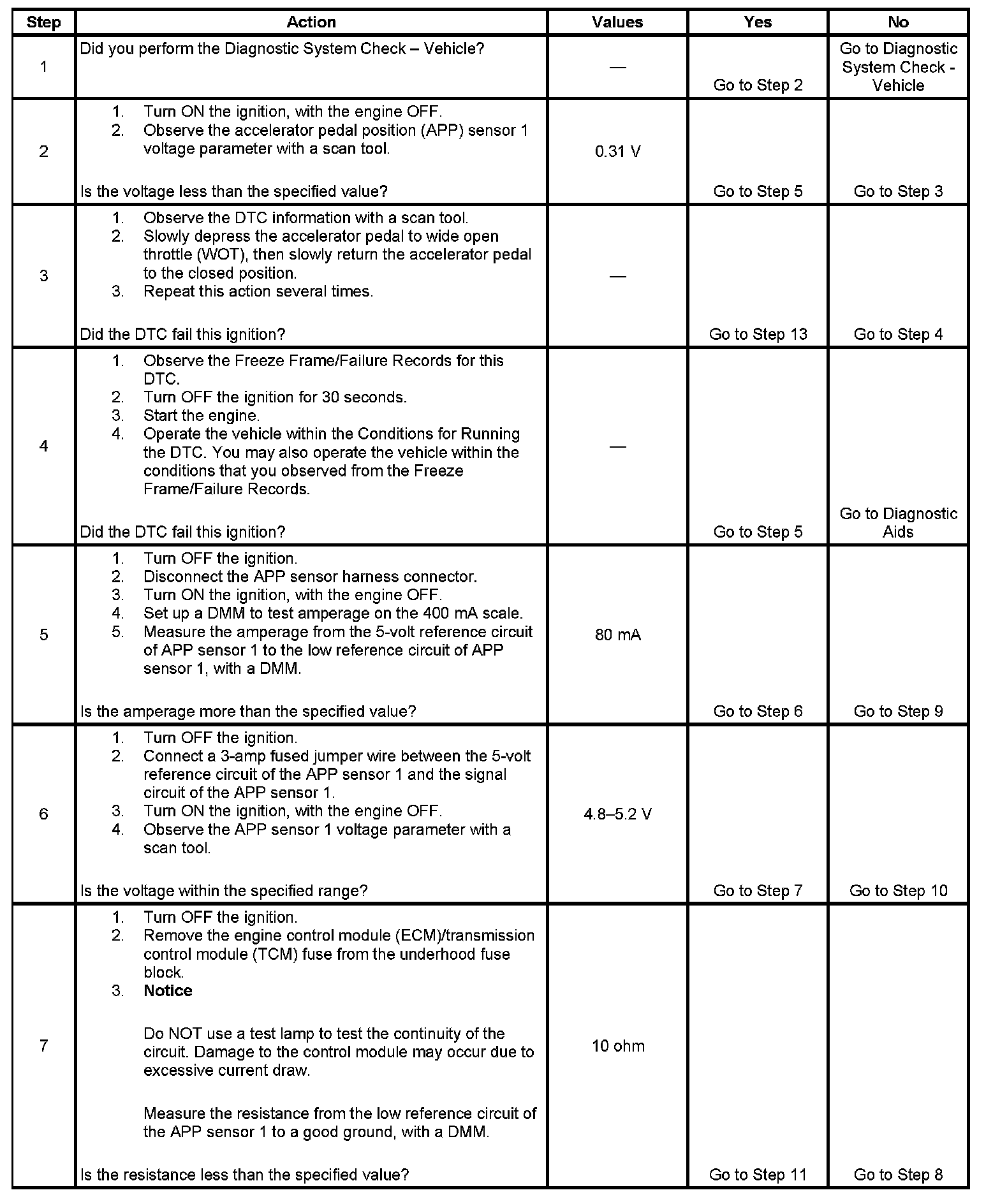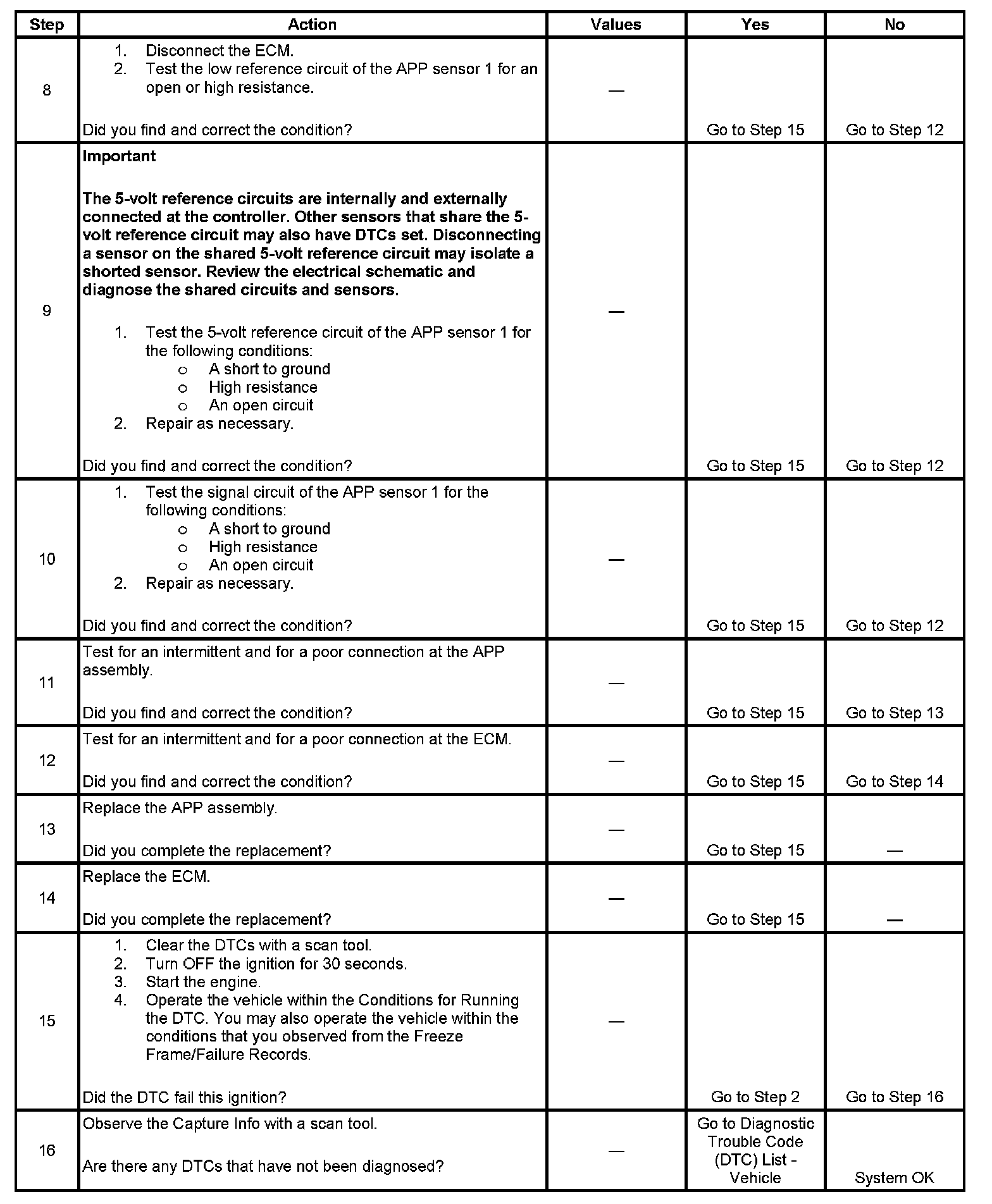 3. This step tests the internal circuits of the APP sensor 1 throughout its range of motion. If this DTC sets when slowly moving the pedal from the rest position to wide open throttle (WOT), replace the APP assembly for an internal fault.