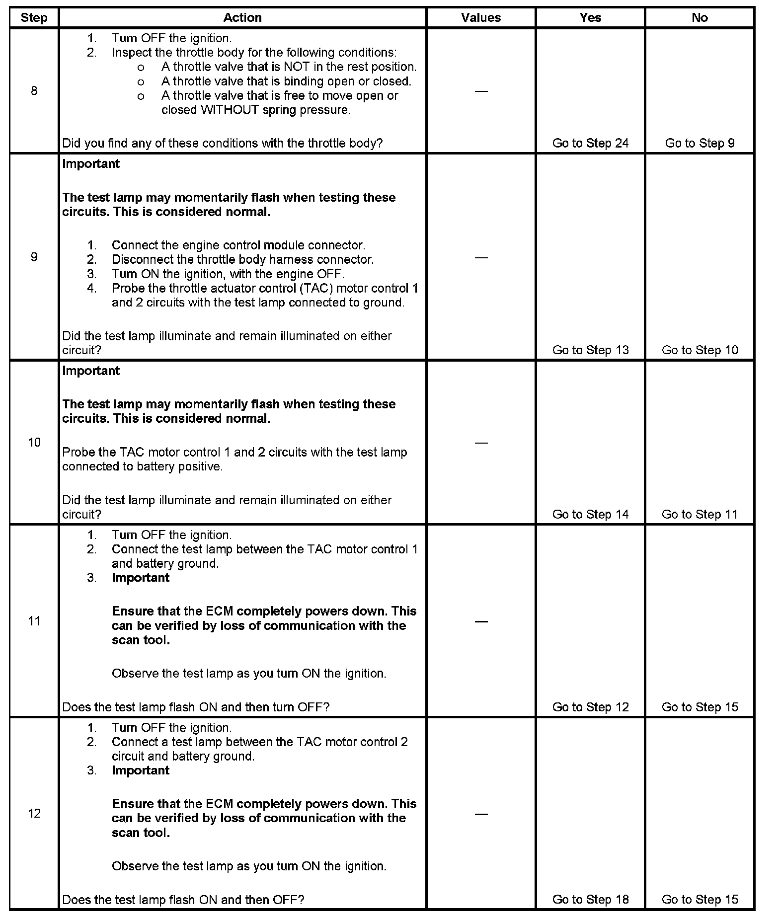 11. When the ignition is turned ON, the ECM operates the throttle control motor to verify the integrity of the system prior to start-up. This can be seen by the momentary flash of the test lamp as the ignition is turned ON.