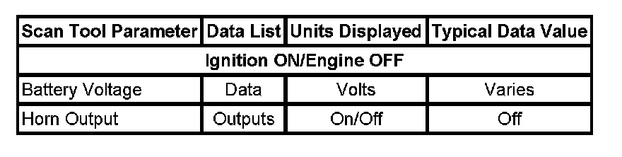 The Horns Scan Tool Data List contains all of the horn related parameters that are available on the scan tool. The parameters in the list are arranged in alphabetical order. The column, "Data List," indicates the location of the parameter within the scan tool menu selections. Use the Horns Scan Tool Data List as directed by a diagnostic table or in order to supplement the diagnostic procedures. Begin all of the diagnostic procedures with Diagnostic System Check - Vehicle.