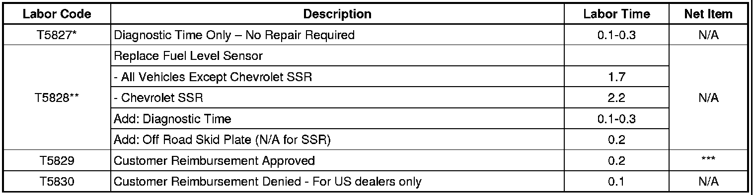 Dealers are to install a new design fuel level sensor. GM will pay 50% of eligible repair expenses, (parts and labor) and the customer will be responsible for the remaining 50%. The amount paid shall be calculated with reference to dealers' already approved warranty parts and labor rates.