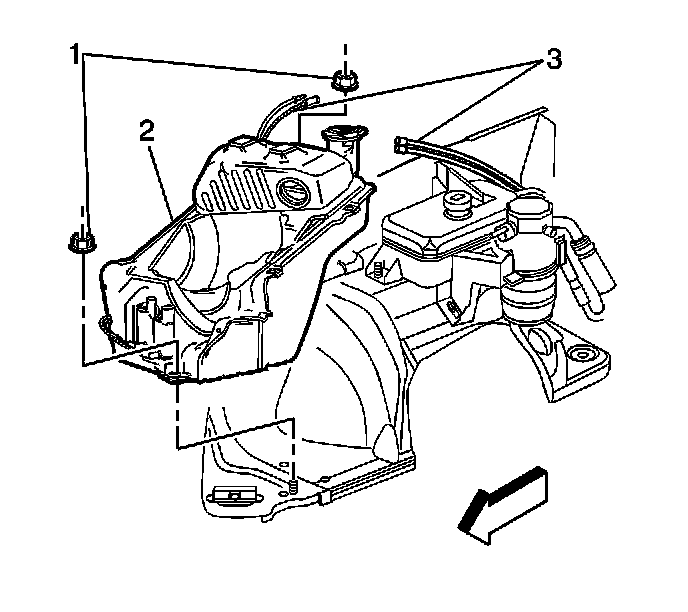 1. Install the lower air filter housing/washer solvent tank assembly (2) onto the mounting studs.