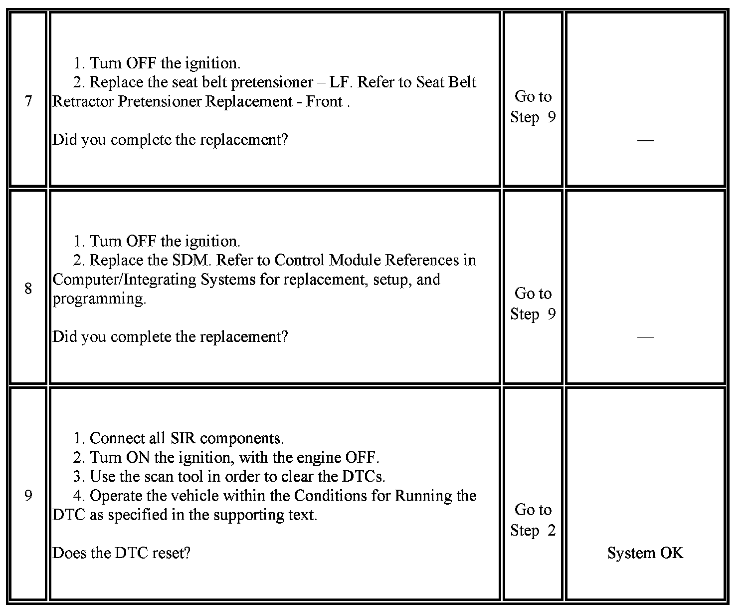 - Seat belt pretensioner - LF high circuit is less than 2.4 volts and the seat belt pretensioner - LF deployment loop is more than 6 ohms for 500 milliseconds.