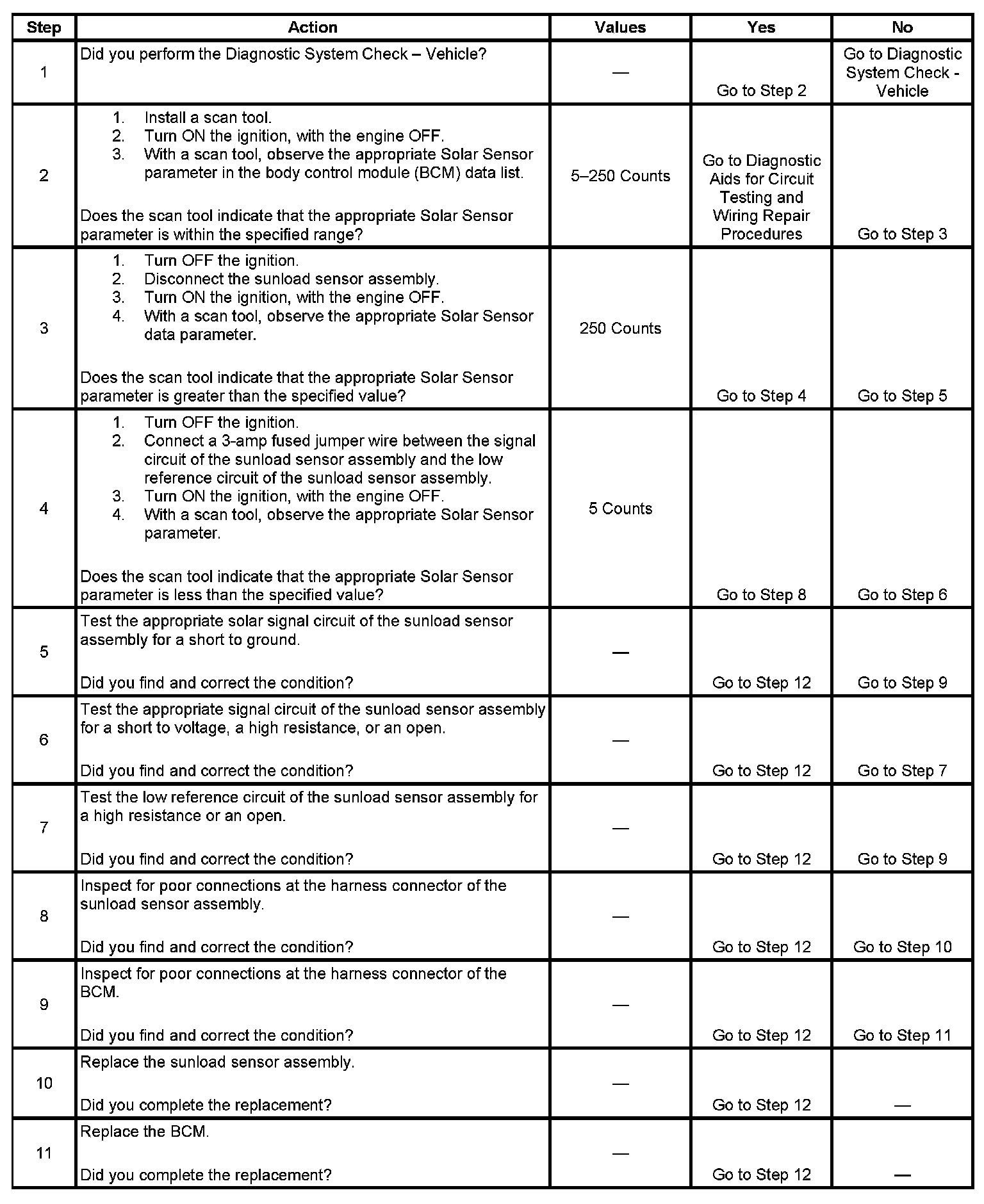 The BCM determines that the value of the sunload sensor signal is less than 5 counts or greater than 250 counts.