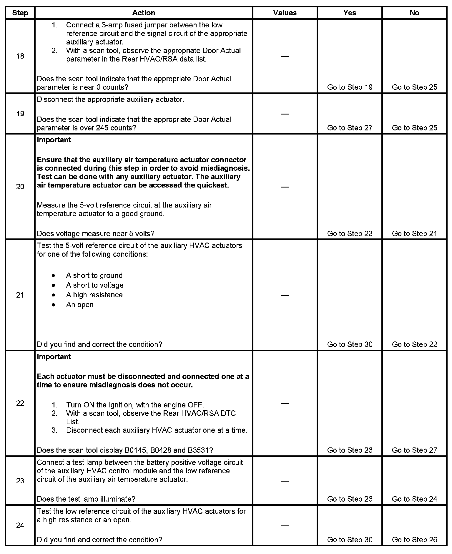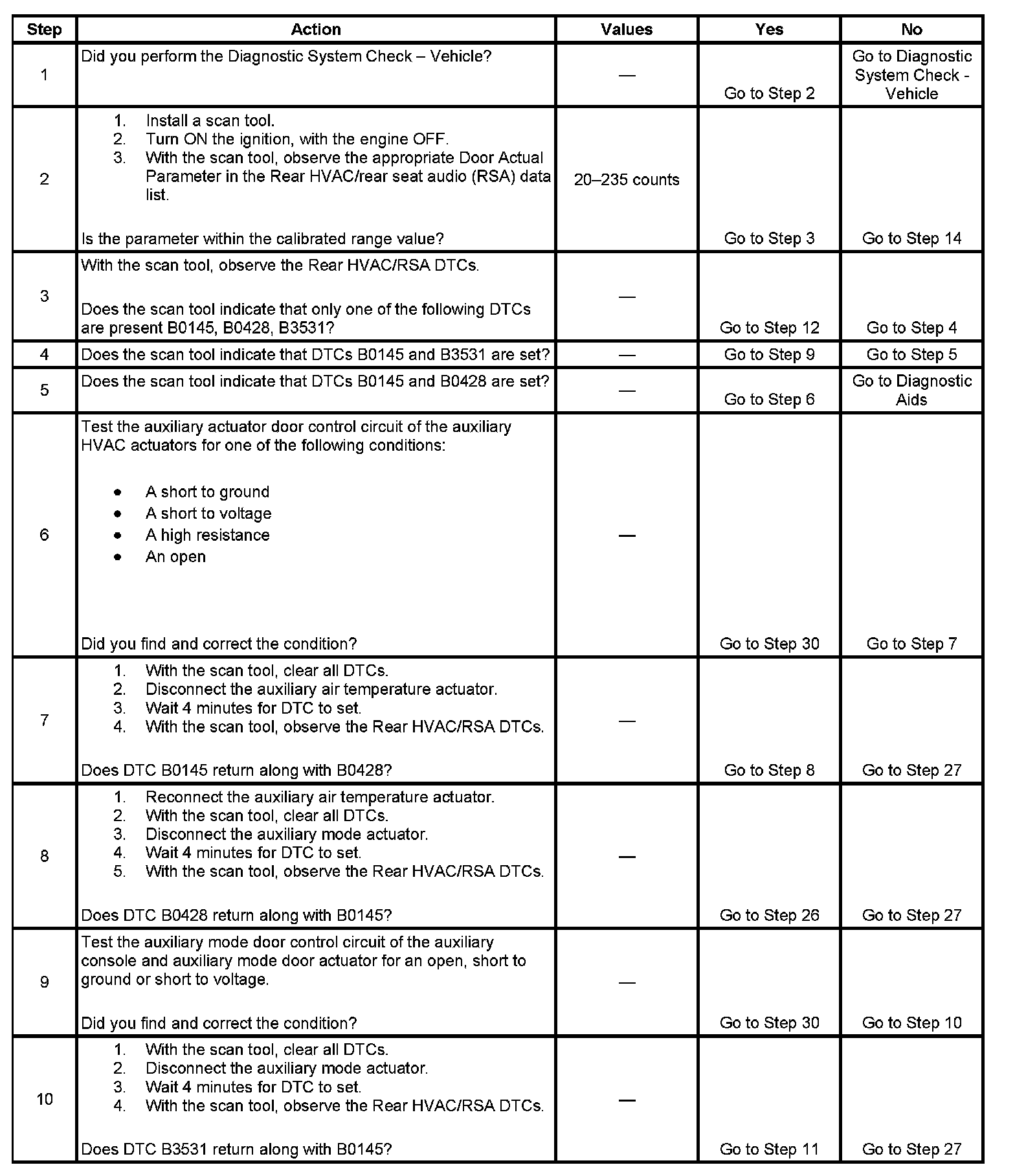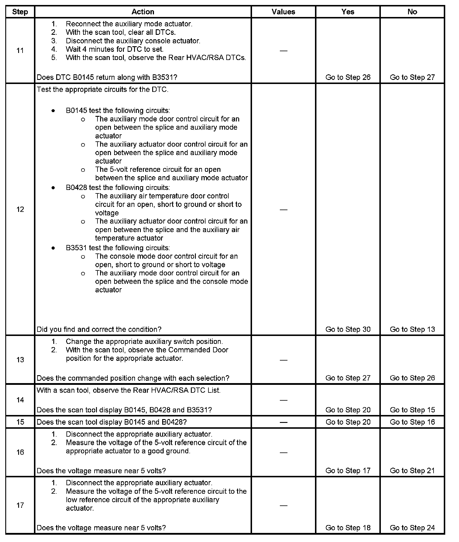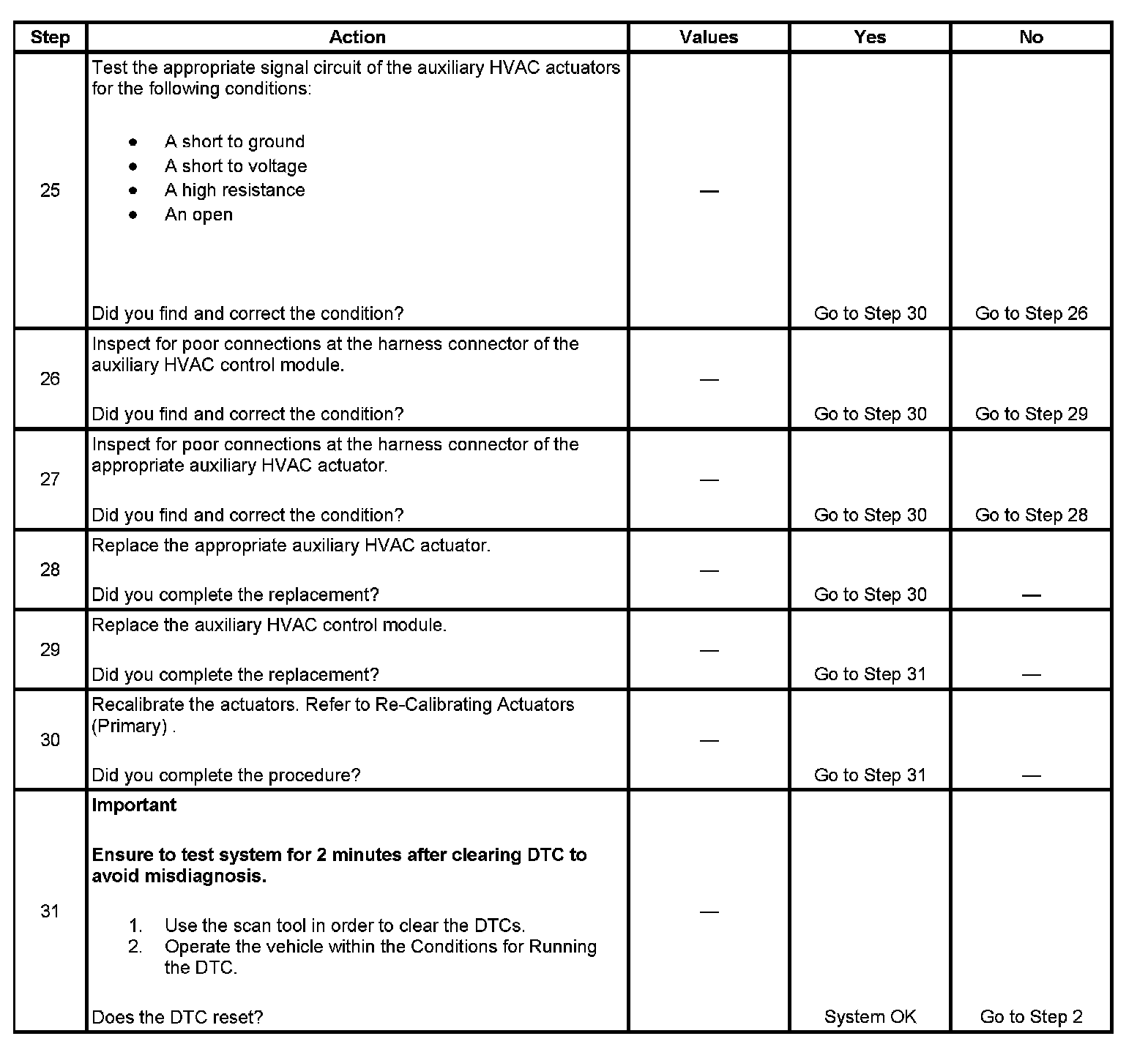 10. The purpose of this step is to try to determine which actuator is internally shorted or if the auxiliary HVAC control module is creating the fault. After DTC are cleared, it can take up to 4 minutes for DTC to set.