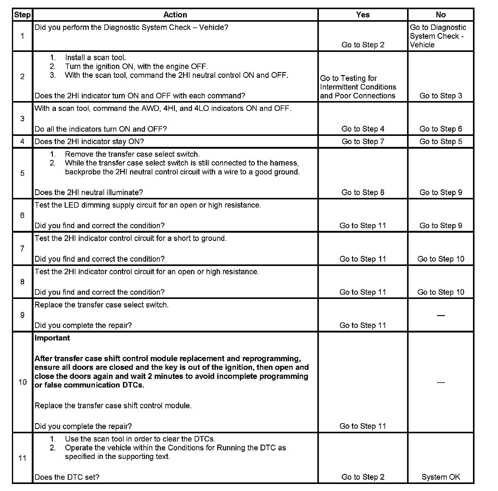 2. This step looks for the visual operation of the 2HI indicator. Command both the ON and OFF states.