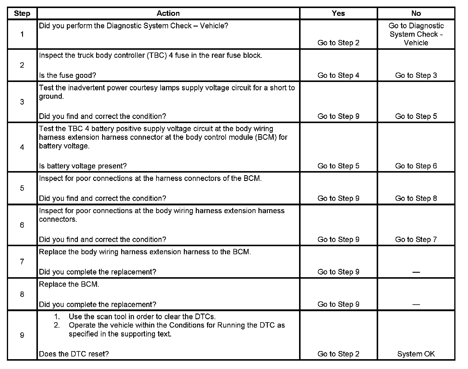 - There is a loss of the rear fuse block truck body controller (TBC) 4 battery supply voltage to the BCM for more than 1 second while one or more of the lamps in the inadvertent power circuit have been activated.