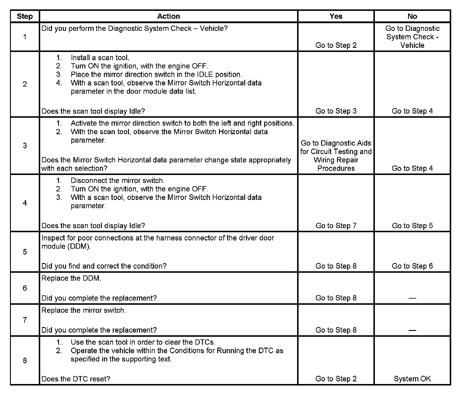 When the fault is no longer present, the door module changes the current DTC to a history DTC. The door module will clear the history DTC after 50 fault free ignition cycles, or in response to a scan tool command.