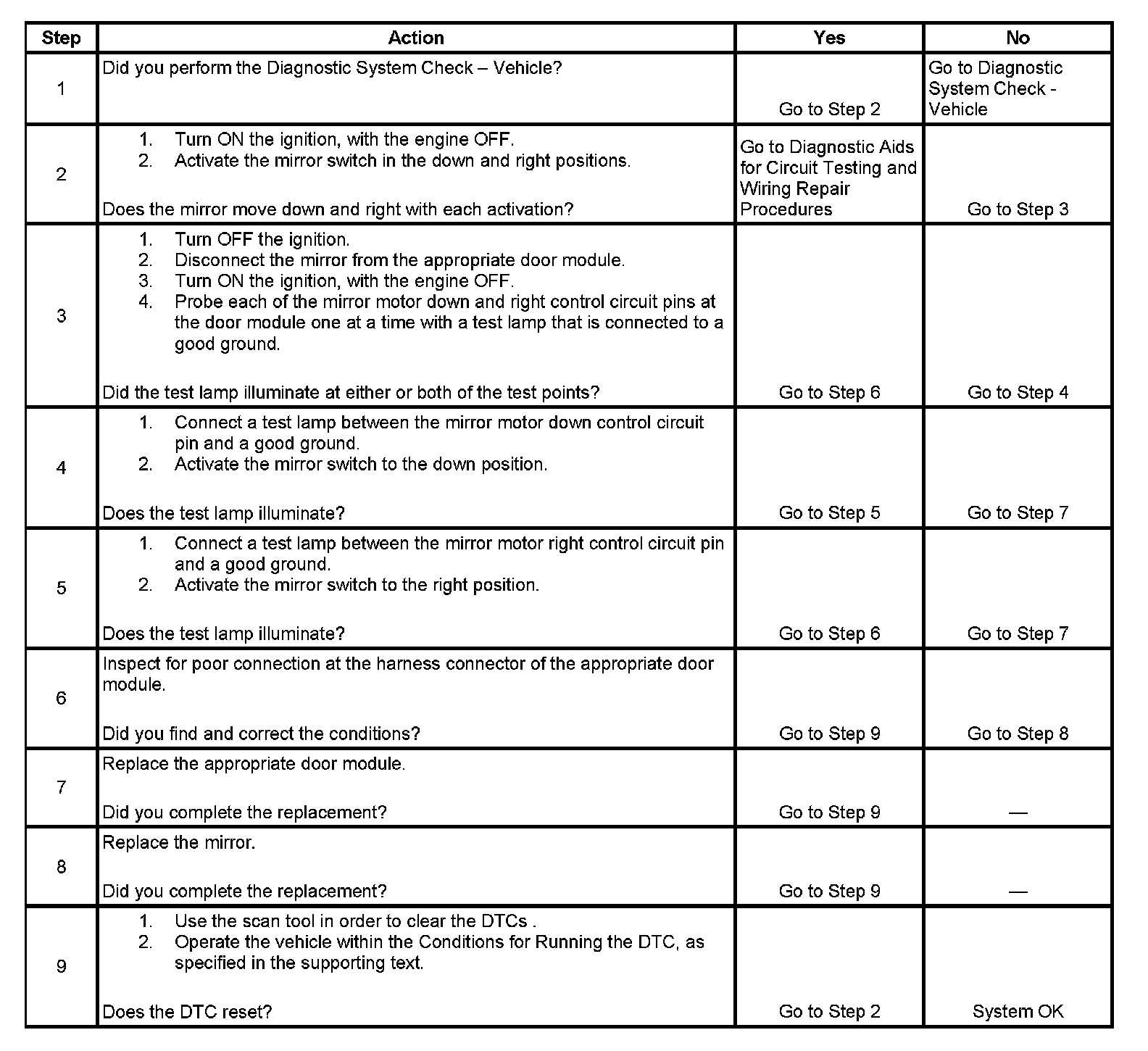 - If the outside rearview mirror motor down control circuit is shorted to ground and the mirror is commanded down