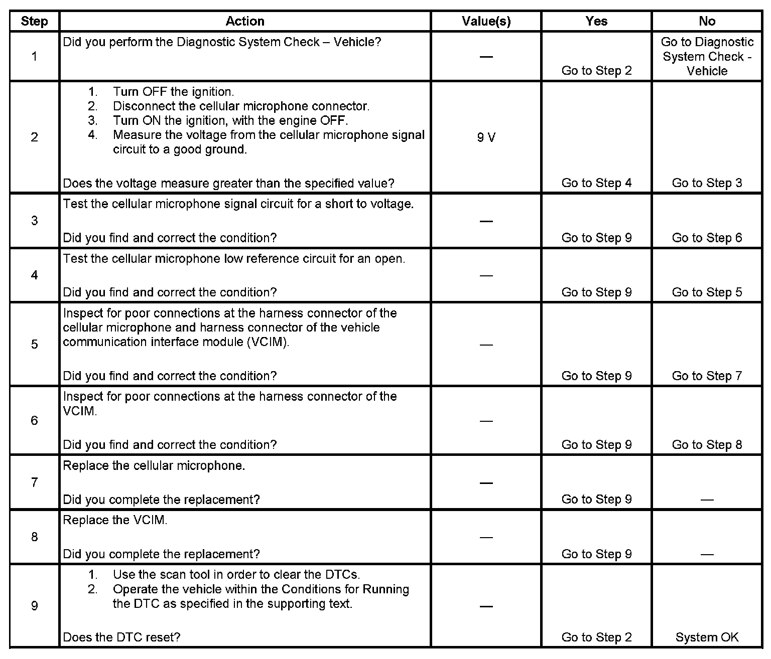 - The VCIM detects an open in the cellular microphone low reference circuit or a short to voltage in the cellular microphone signal circuit.