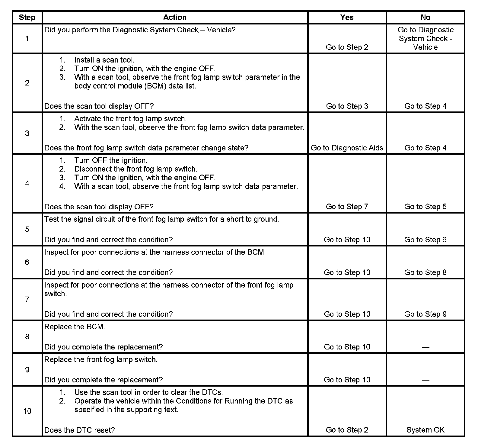 The body control module (BCM) monitors the front fog lamp switch signal circuit in order to determine when the fog lamp relay is to be energized. When the BCM senses that the front fog lamp switch signal circuit is grounded momentarily by pressing the fog lamp switch, the BCM energizes the fog lamp relay by grounding the fog lamp relay control circuit.