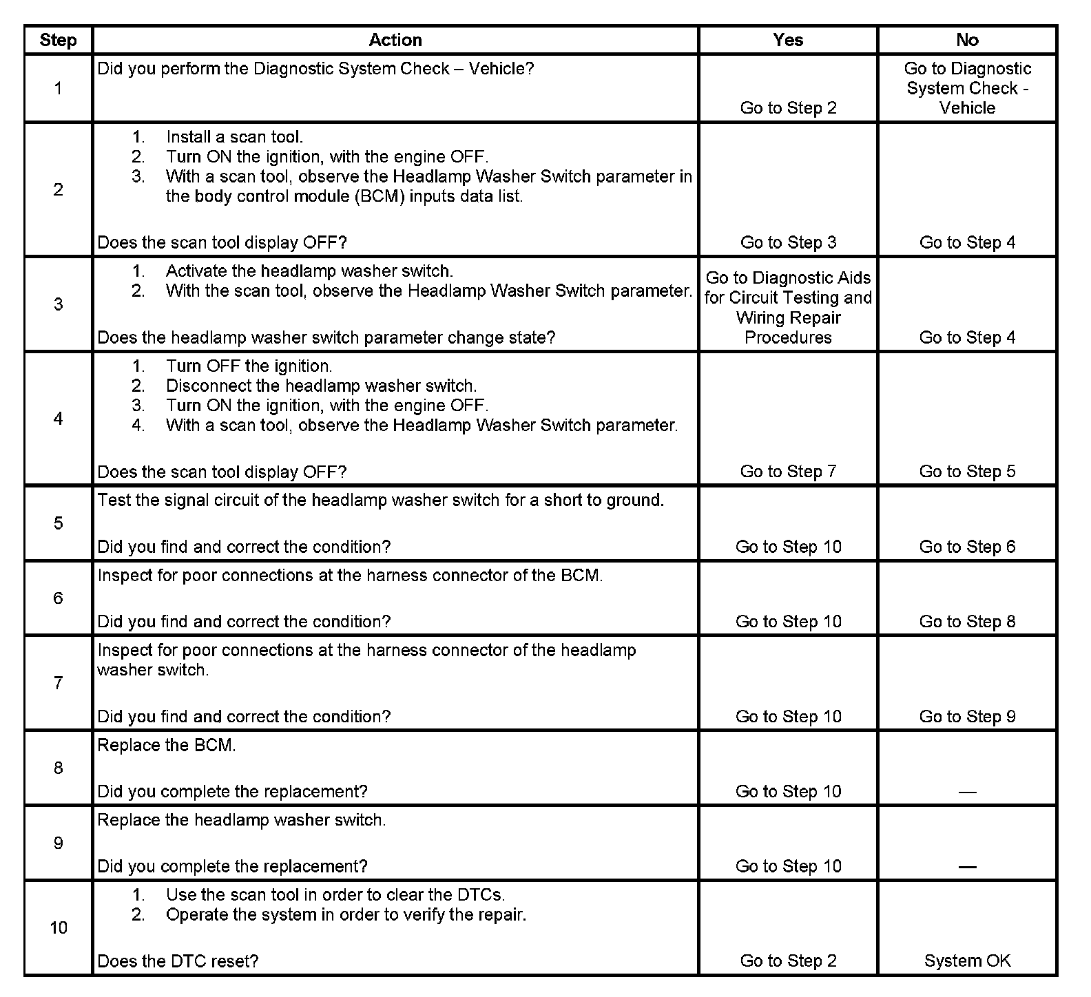 4. This step determines if the fault is in the headlamp washer switch. If the switch input to the BCM changes to an inactive state when disconnected the switch contacts are stuck or shorted to ground.