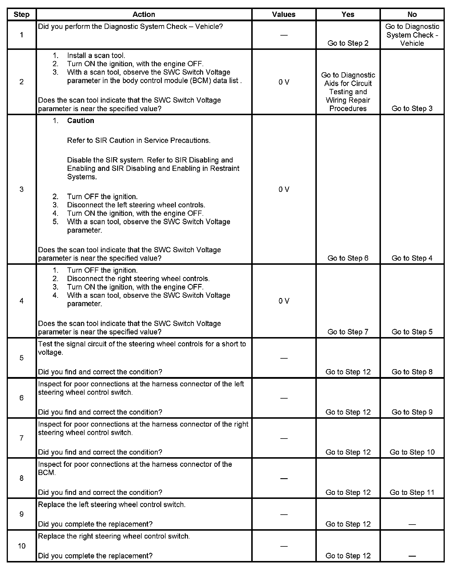 The steering wheel controls are momentary contact switches that connect a series of resistors so that each switch selection corresponds to a fixed resistance value. The body control module (BCM) determines which switch has been pressed by the voltage drop across the corresponding resistance value. The BCM supplies voltage to the steering wheel controls through the rear wiper/washer switch supply voltage circuit. The BCM monitors the switch voltage on the remote radio control signal circuit.