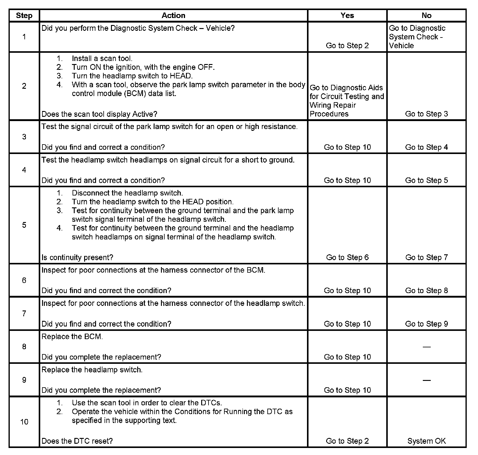 The body control module (BCM) monitors the park lamp switch signal circuit and the headlamp switch headlamps on signal circuit in order to determine when the park lamps and headlamps should be illuminated. When the headlamp switch is turned to PARK, the BCM senses that the park lamp switch signal circuit is grounded and the headlamps switch headlamps on signal circuit is open. The BCM will then energize the park lamp relay illuminating the park lamps. When the headlamp switch is turned to HEAD, the BCM senses that the park lamp switch signal circuit and the headlamp switch headlamps on signal circuit are grounded. The BCM will then energize the park lamp relay and headlamp driver module (HDM) illuminating the park lamps and headlamps.