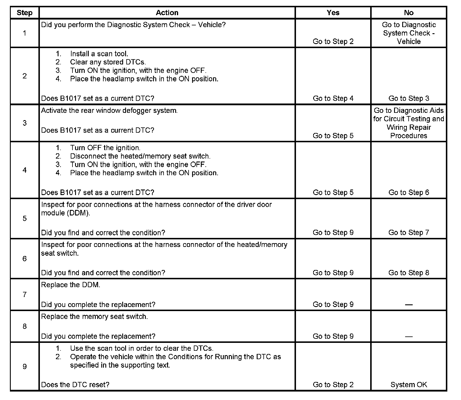 2. This step determines if the heated/memory seat switch illumination circuit is the cause for DTC B1017 setting.