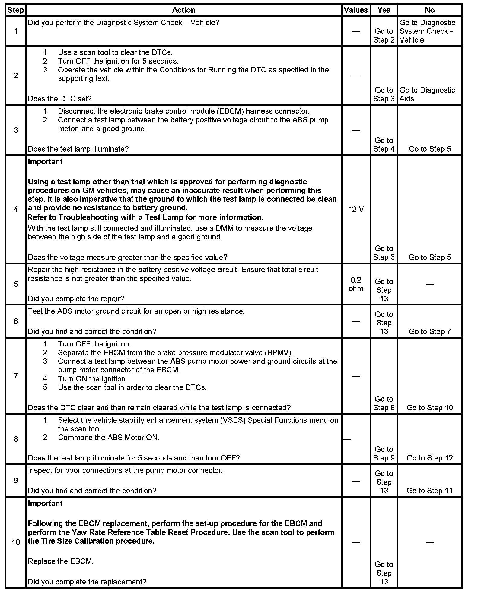 The EBCM detects an open pump motor circuit, a shorted pump motor, or a seized pump motor or ABS pump.
