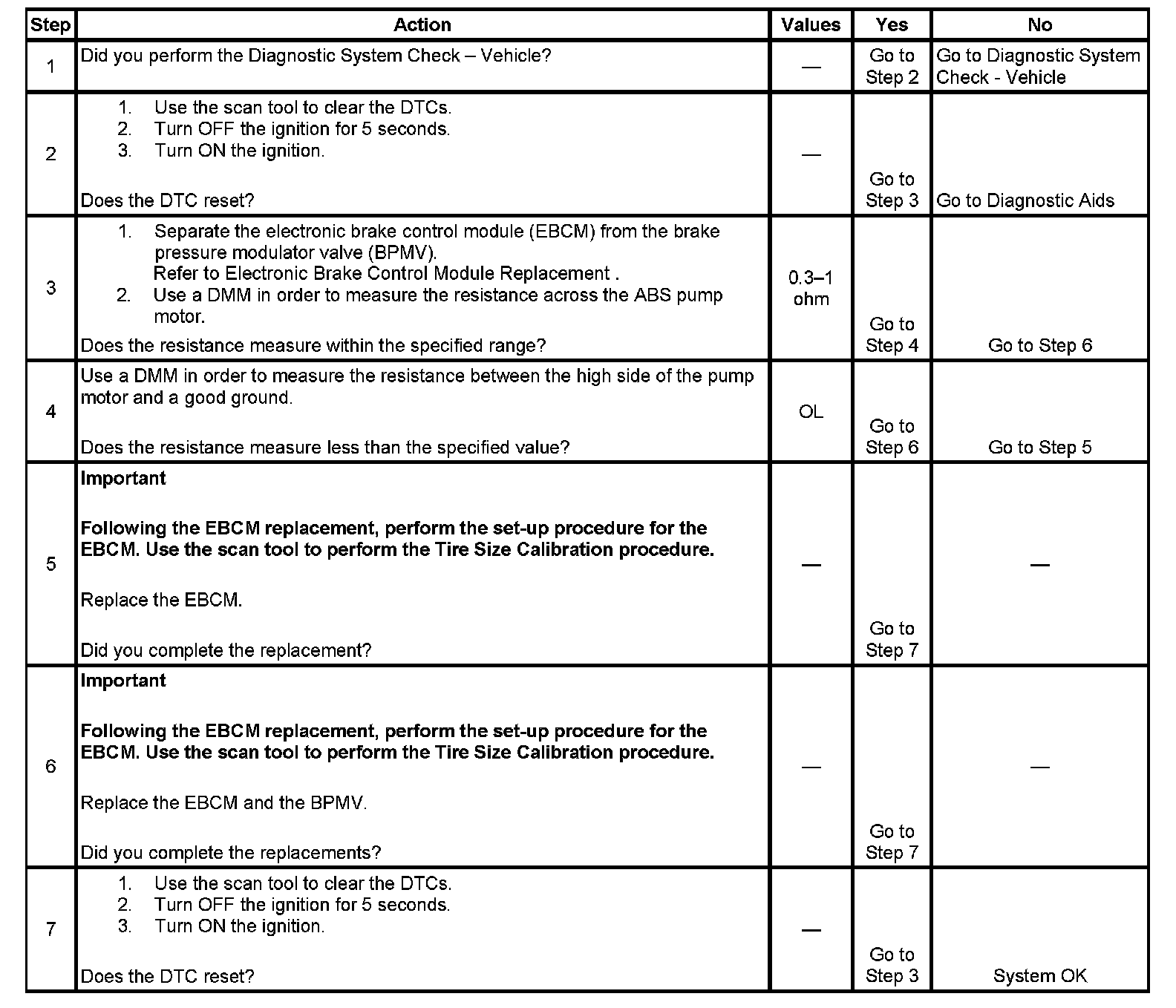3. A shorted ABS pump motor may damage the contacts within the system relay. It is imperative that the steps in the table be followed to prevent damage to a replacement EBCM.