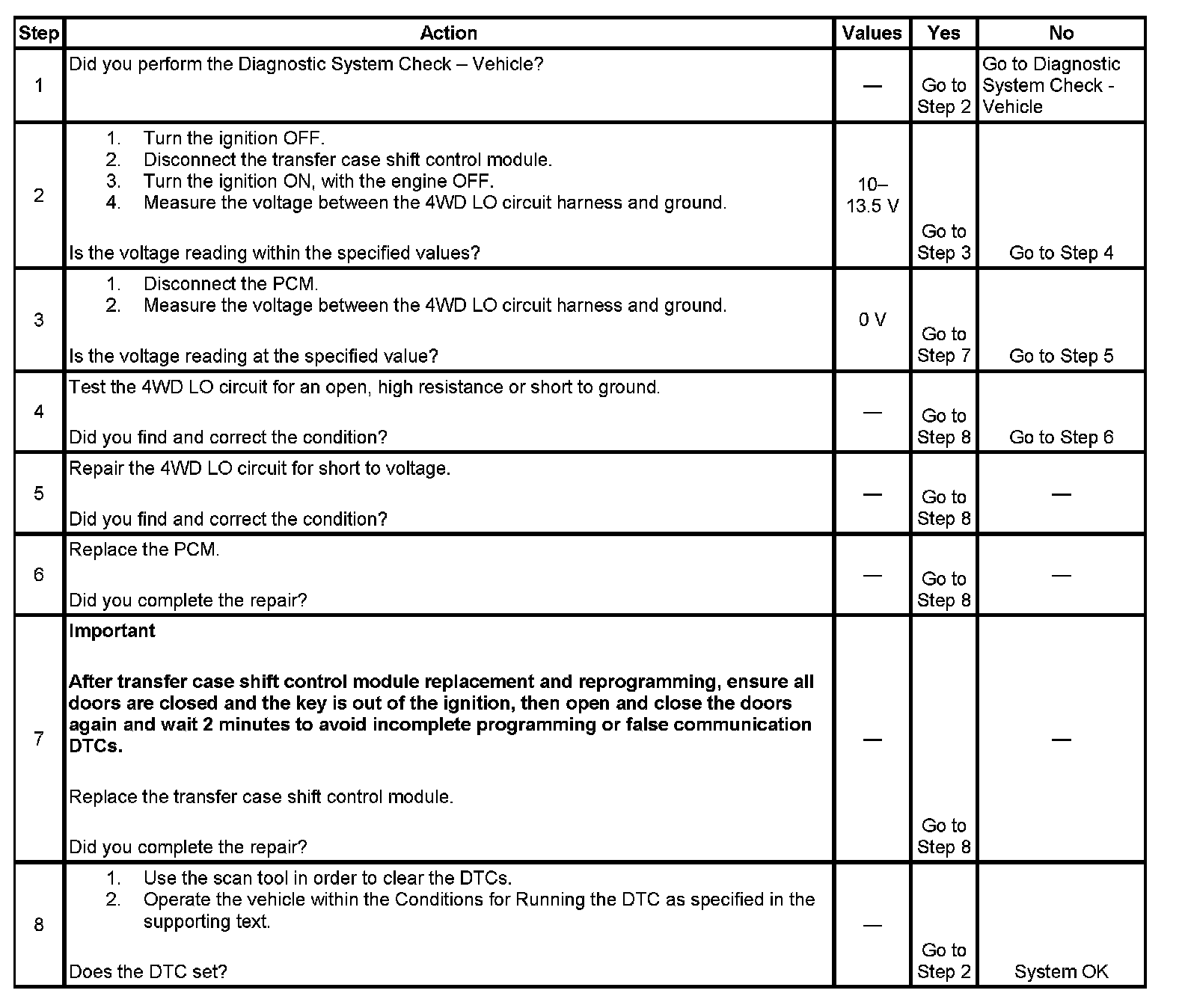 ^ After the transfer case shift control module grounds the output, the 4WD LO circuit, and reads back a high voltage, the DTC sets. The system does not attempt setting the DTC again for 5 seconds.