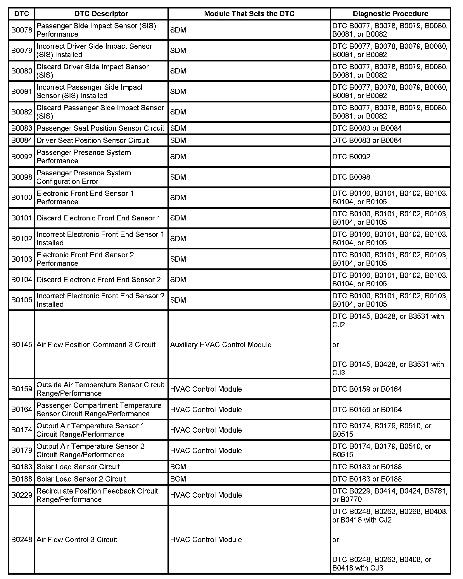 DTCs B0078 - B0248: