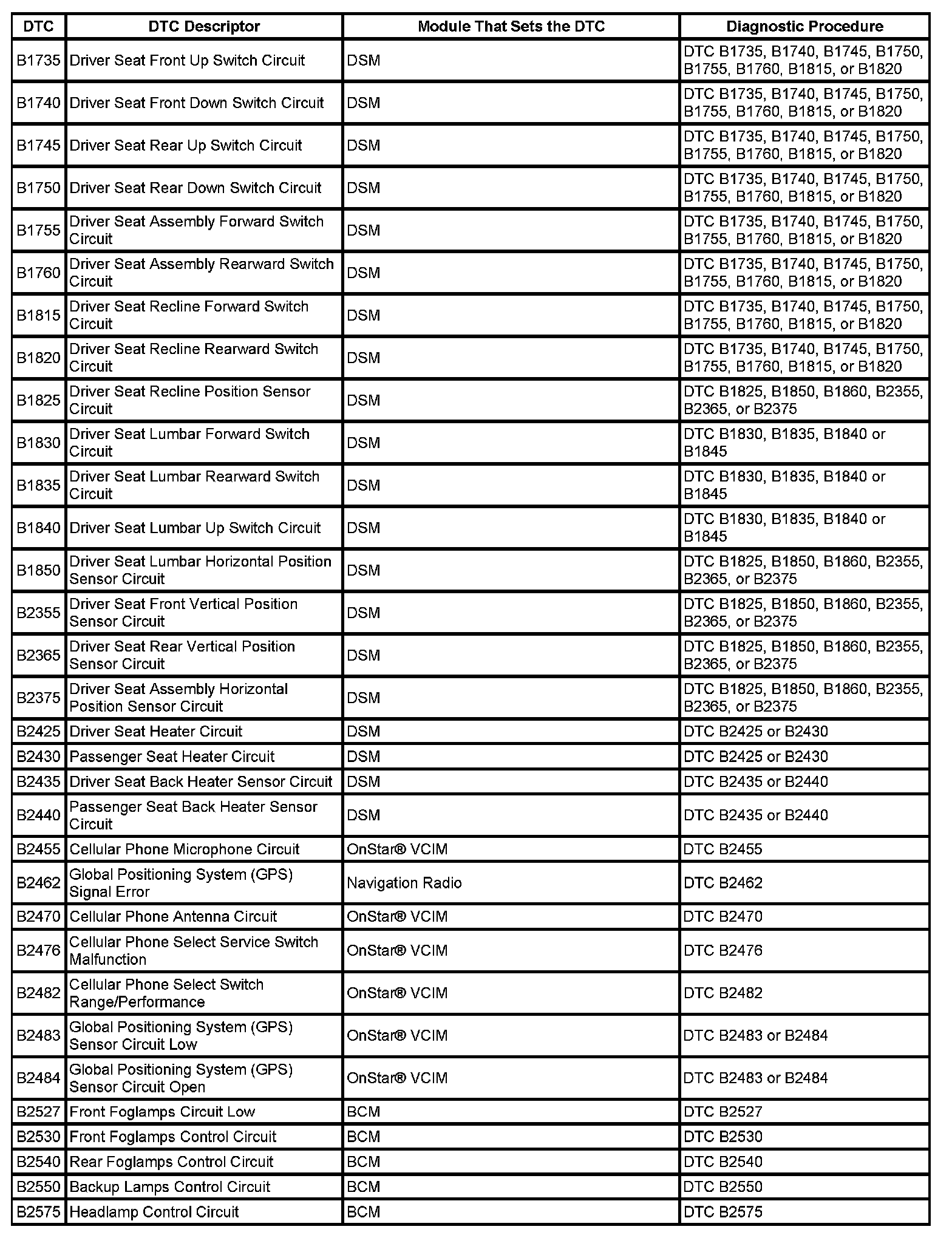 DTCs B1735 - B2575: