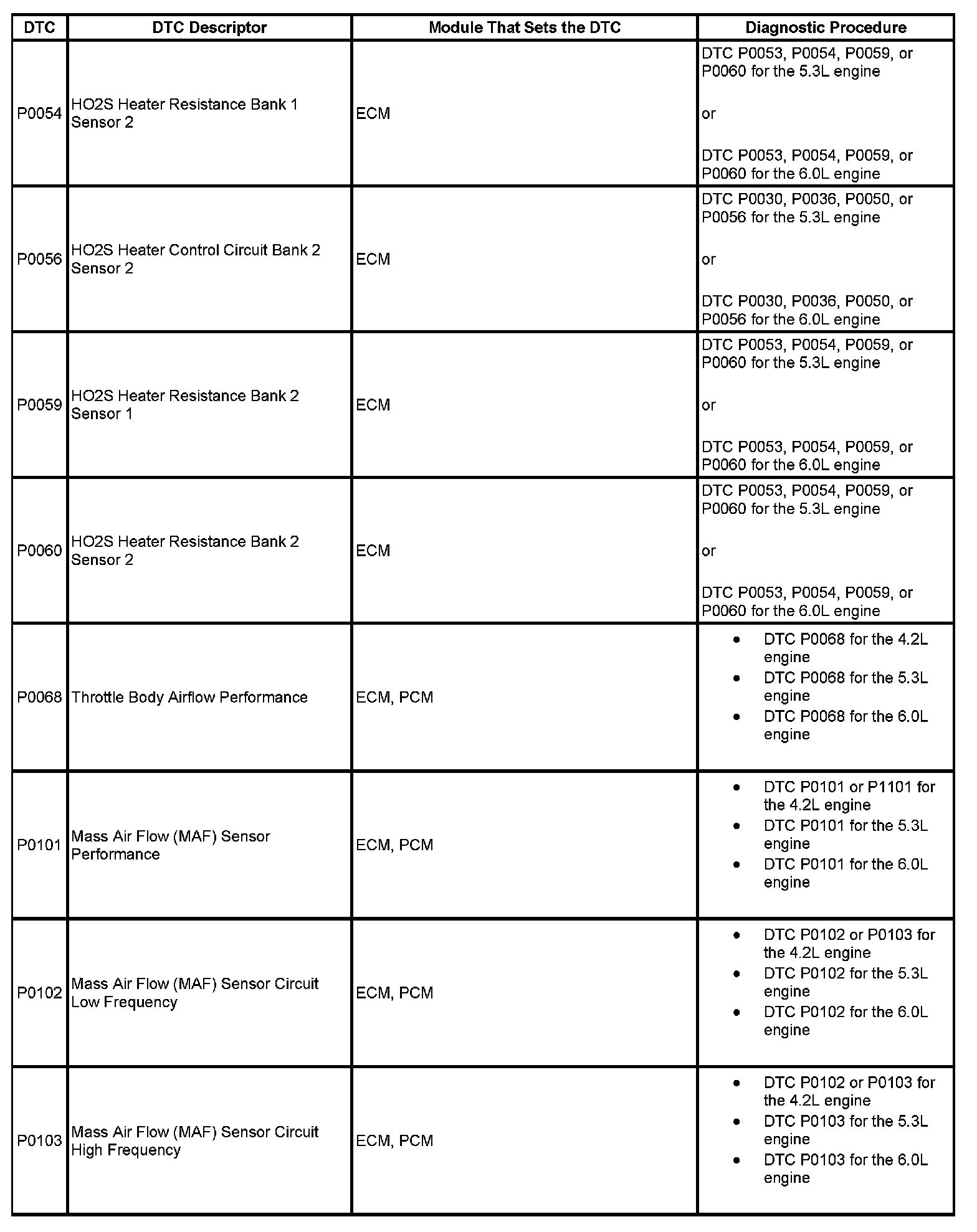 DTCs P0054 - P0103: