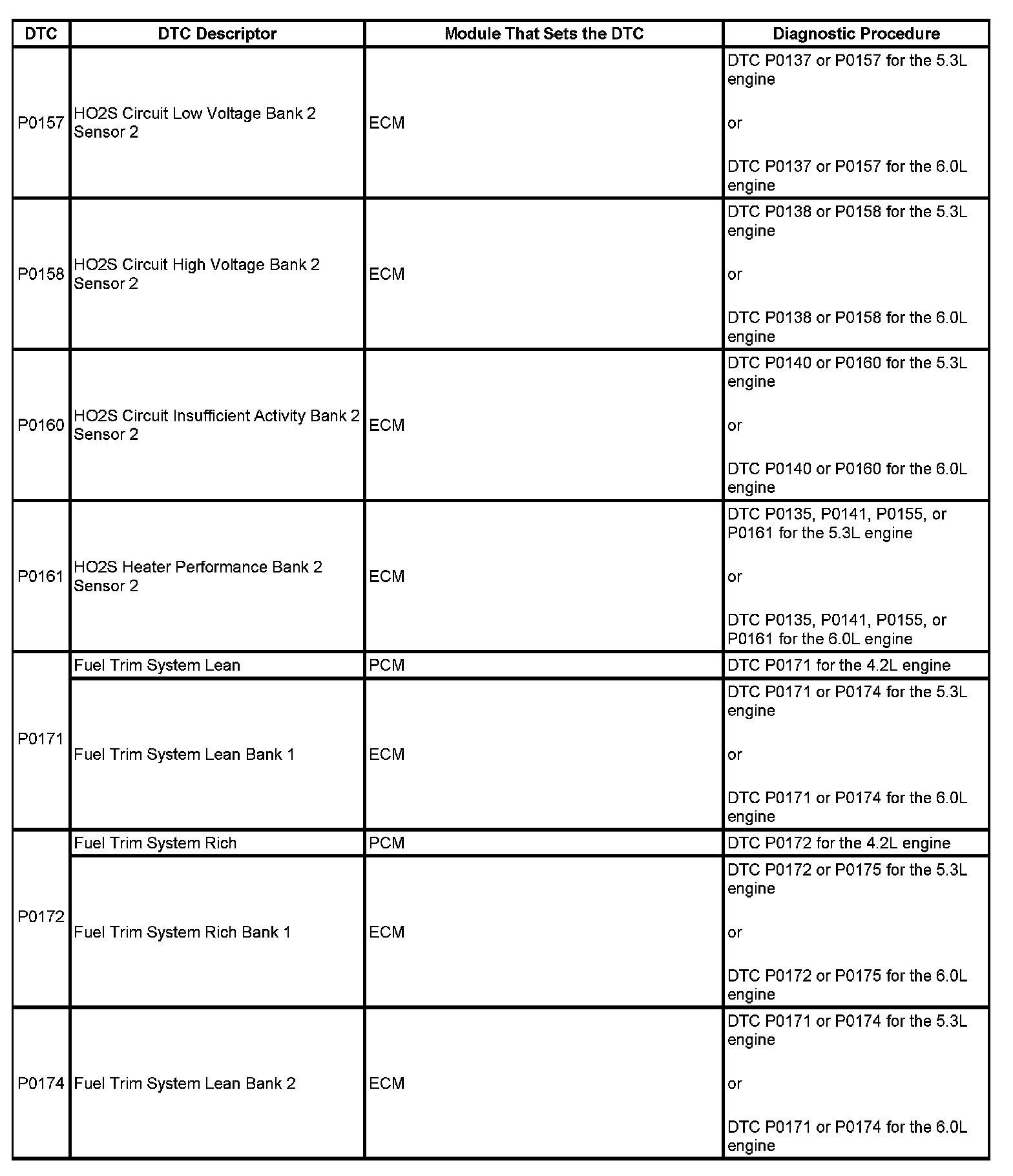 DTCs P0157 - P0174: