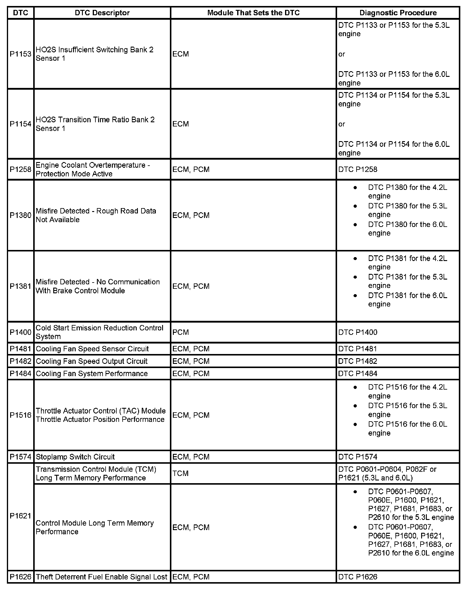 DTCs P1153 - P1626: