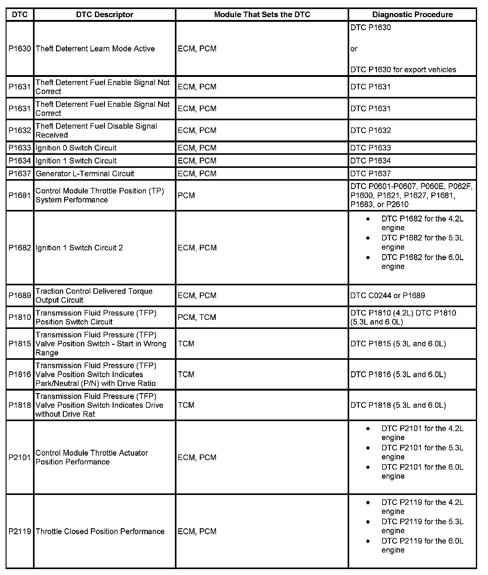 DTCs P1630 - P2119: