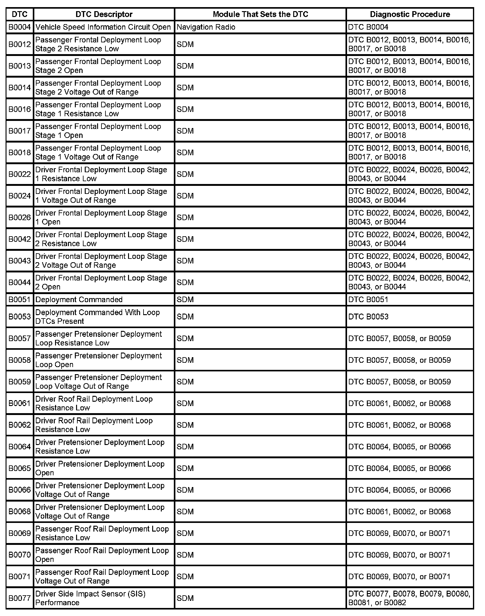 DTCs B0004 - B0077: