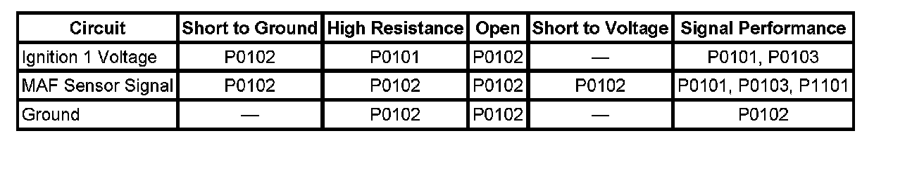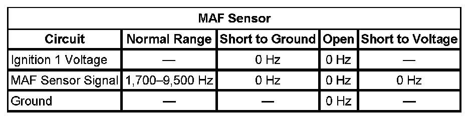 The PCM applies 5 volts to the MAF sensor on the MAF sensor signal circuit. The sensor uses the voltage to produce a frequency based on the inlet air flow through the sensor bore. The frequency varies within a range of near 1,700 Hertz at idle to near 9,500 Hertz at maximum engine load.