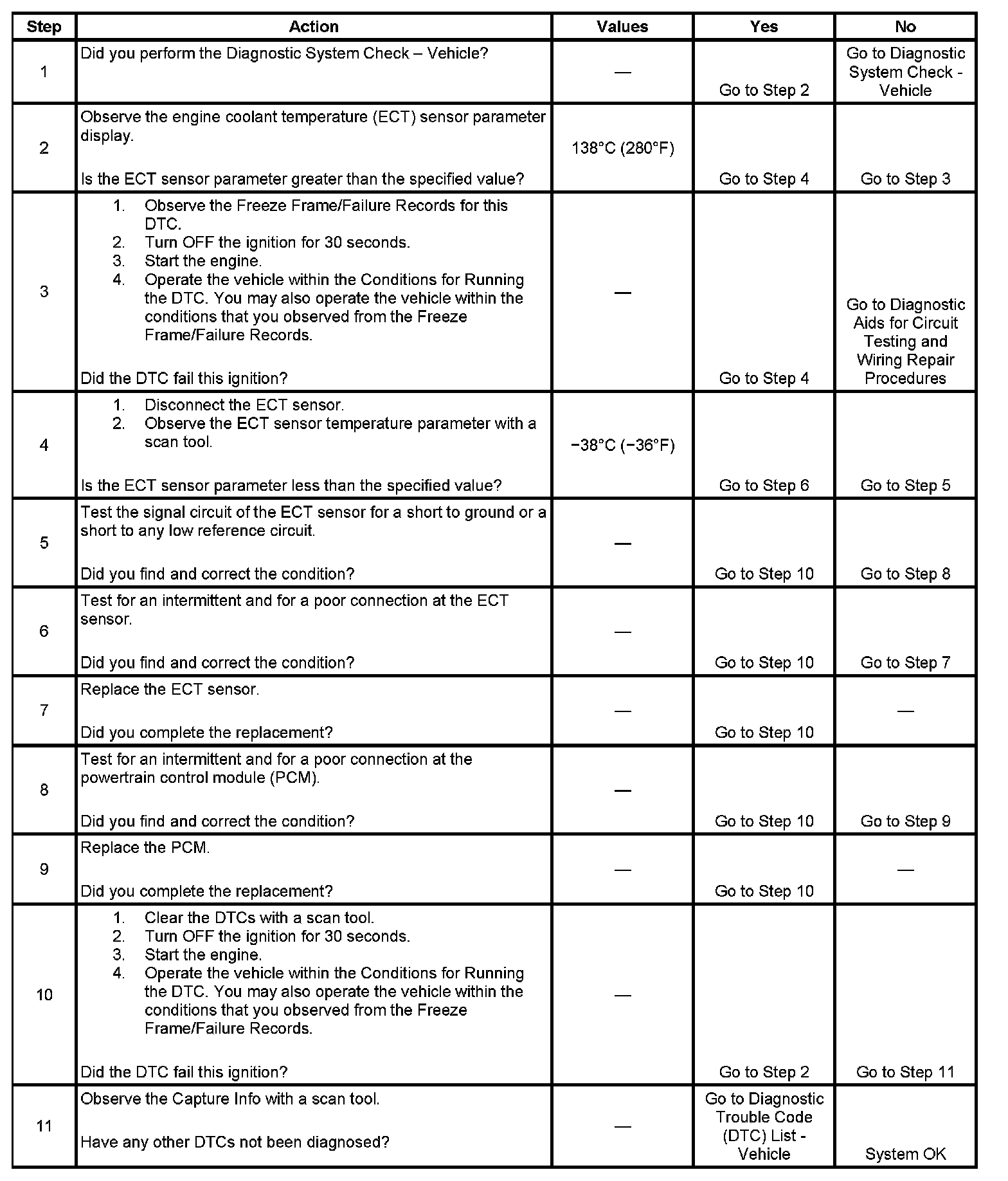 The engine coolant temperature (ECT) sensor is a variable resistor, that measures the temperature of the engine coolant. The powertrain control module (PCM) supplies 5 volts to the ECT signal circuit and a ground for the ECT low reference circuit. When the ECT is cold, the sensor resistance is high. When the ECT increases, the sensor resistance decreases. With high sensor resistance, the PCM detects a high voltage on the ECT signal circuit. With lower sensor resistance, the PCM detects a lower voltage on the ECT signal circuit. If the PCM detects an excessively low ECT signal voltage, which is a high temperature indication, DTC P0117 sets.