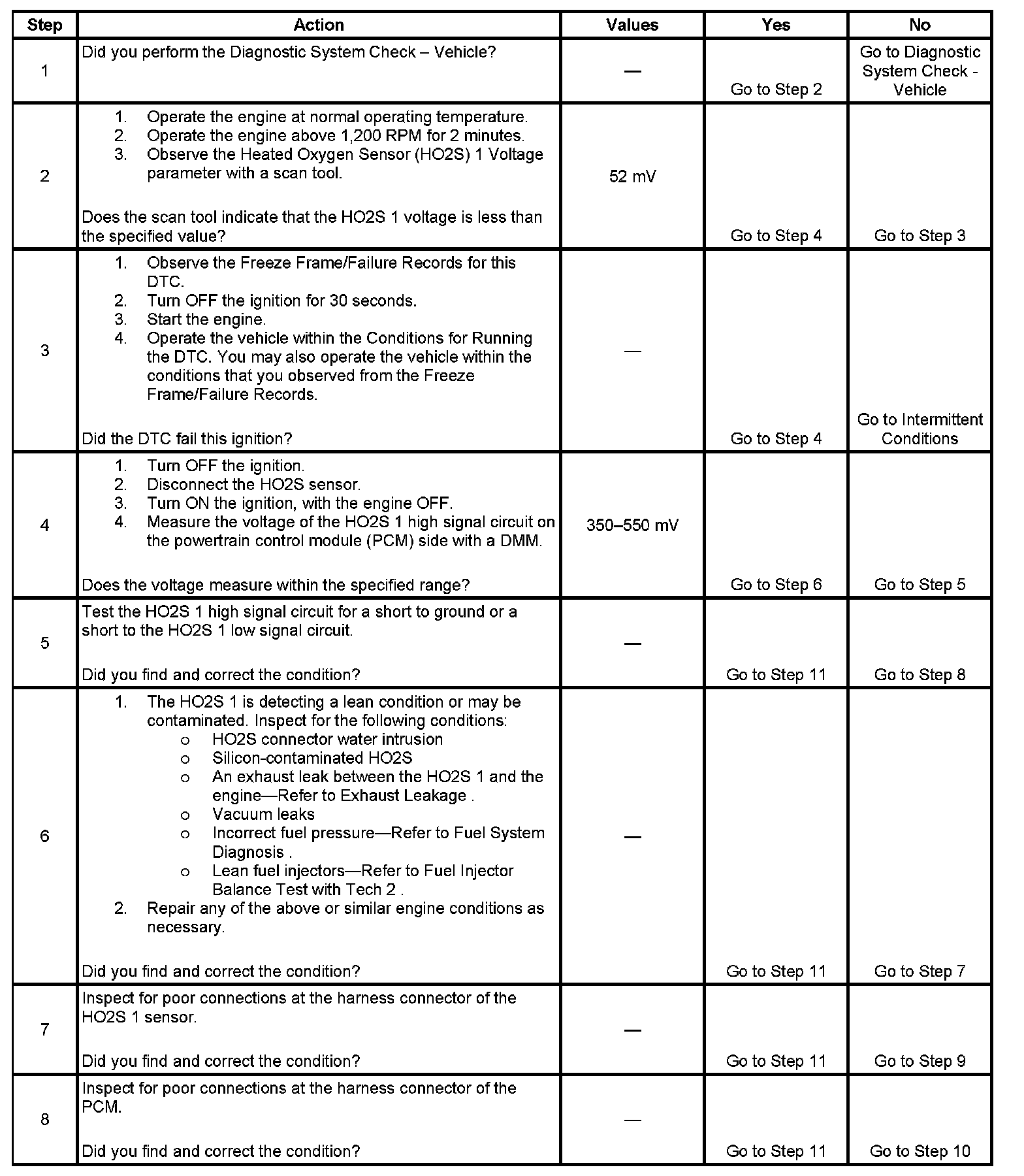 - The PCM detects that the HO2S 1 Voltage parameter is less than 52 mV.