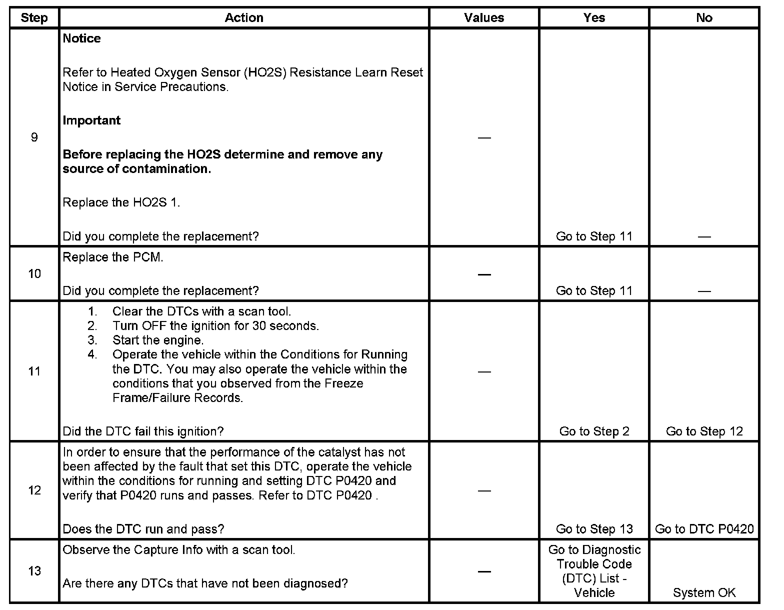 The numbers below refer to the step numbers on the diagnostic table.