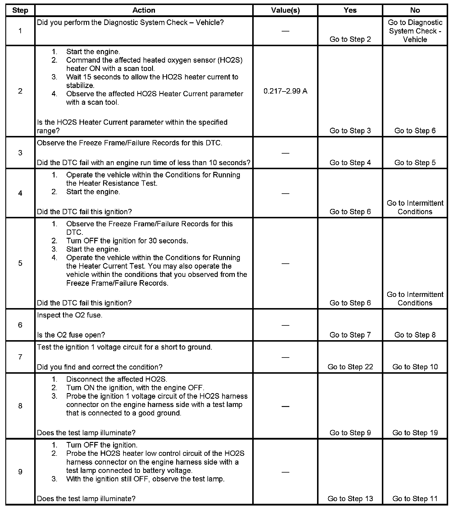 - DTCs P0135 or P0141 set within 200 seconds during the heater current test when the above condition is met.