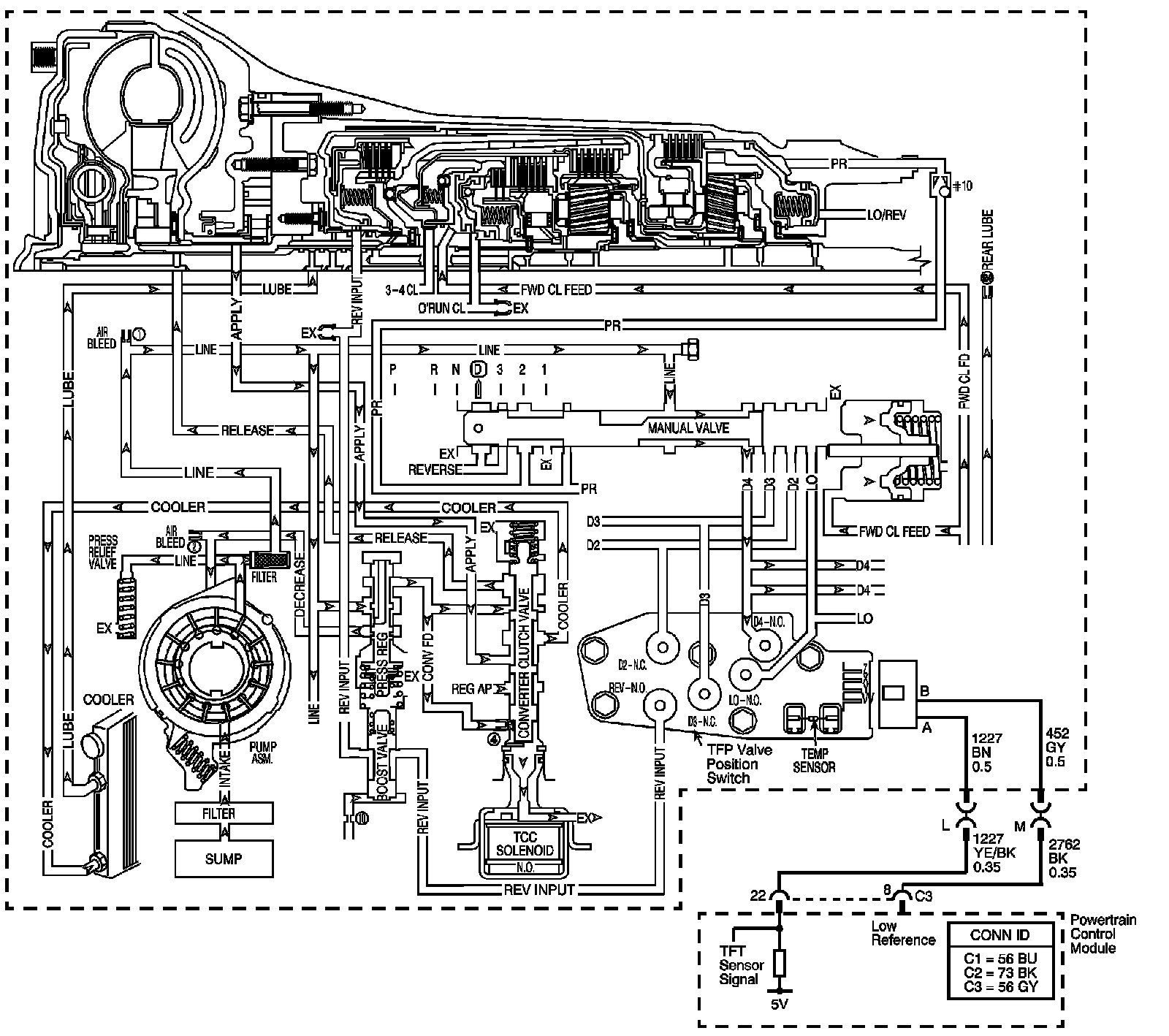 The flow of transmission fluid starts in the bottom pan and is drawn through the filter, control valve body assembly, transmission case and into the oil pump assembly. The oil pump assembly pressurizes the fluid and directs it to the pressure regulator valve where it becomes the main supply of fluid to the various components and hydraulic circuits in the transmission. Hot fluid exiting the torque converter flows through the converter clutch apply valve and into the transmission cooler lines to the oil cooler located in the vehicle radiator, and auxiliary cooler if equipped. From the cooler, fluid returns to cool and lubricate the front of the transmission. In forward drive ranges, D4 fluid from the manual valve is routed through an orificed cup plug in the rear of the transmission case to feed the rear lube fluid circuit.