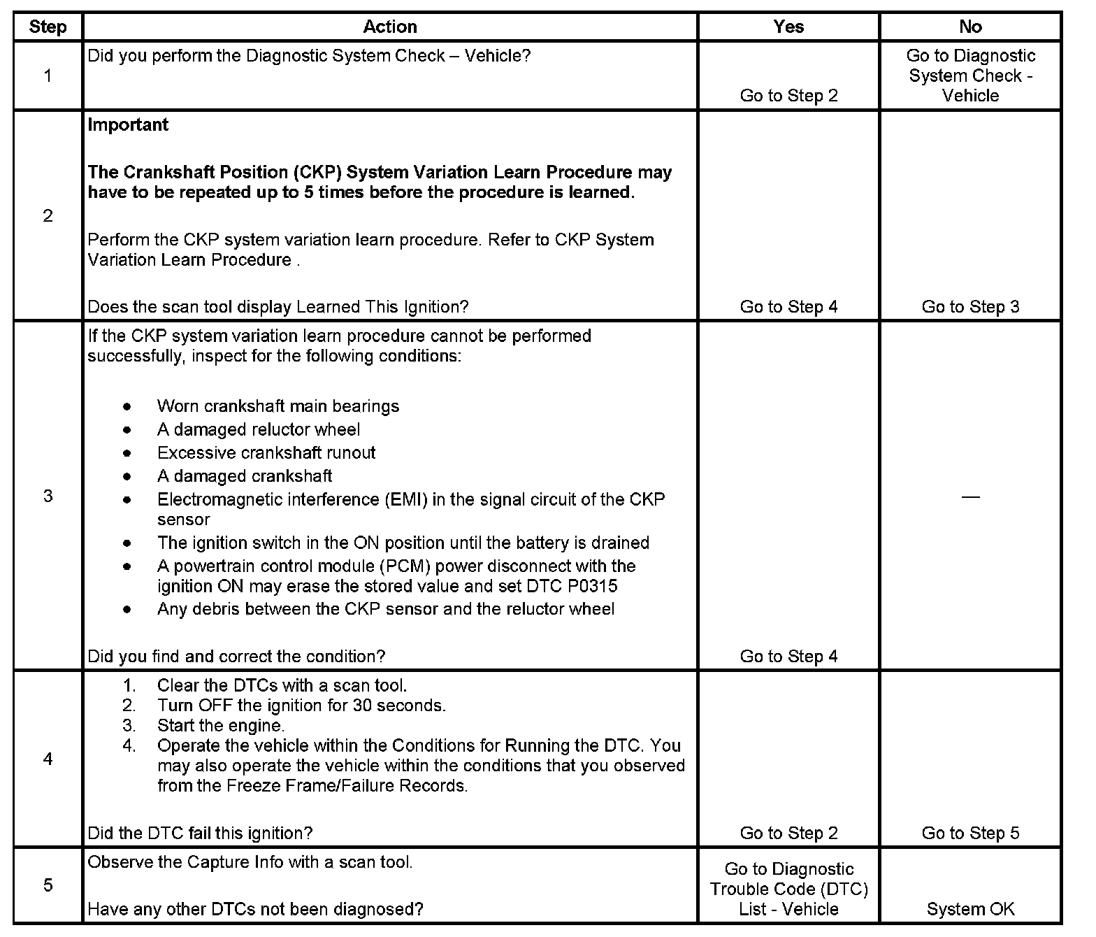 The crankshaft position (CKP) system variation learn feature is used to calculate reference period errors caused by slight tolerance variations in the crankshaft, and the CKP sensor. The calculated error allows the powertrain control module (PCM) to accurately compensate for reference period variations. This enhances the ability of the PCM to detect misfire events over a wider range of engine speed and load. The PCM stores the CKP system variation values after a learn procedure has been performed. If the actual CKP variation is not within the CKP system variation compensating values stored in the PCM, DTC P0300 may set. If the PCM detects the CKP system variation values are not stored in the PCM memory, DTC P0315 sets.
