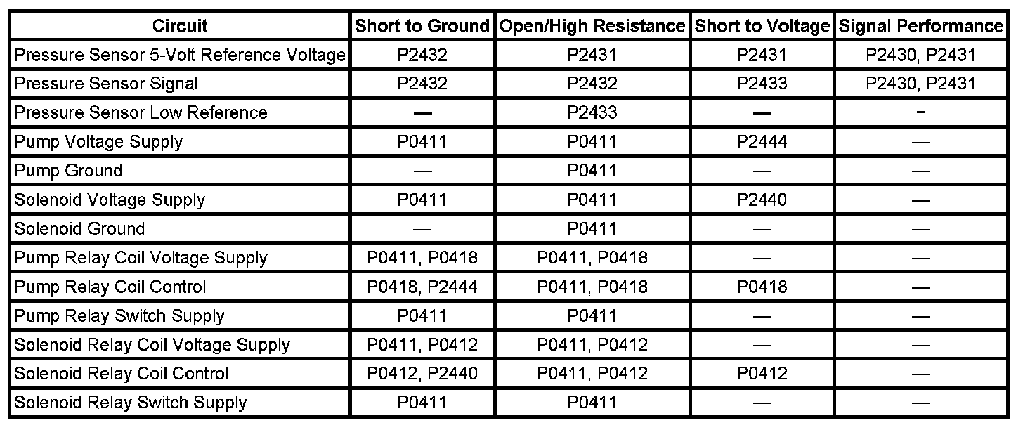 In all 3 phases, testing is accomplished by comparing the measured pressure against the expected pressure. The control module can detect faults in the AIR pump, AIR control solenoid valve/pressure sensor assembly, and the exhaust check valve. The pressure sensor can also detect leaks and restrictions in the secondary AIR system plumbing.