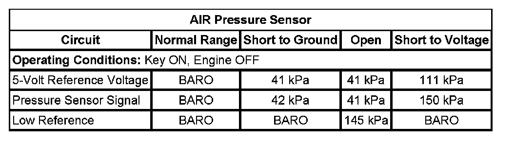 The secondary air injection (AIR) system aids in the reduction of hydrocarbon emissions during a cold start. The system forces fresh filtered air into the exhaust stream in order to accelerate the catalyst operation. An electric air pump, the secondary AIR injection pump, provides filtered air on demand to the AIR control solenoid valve/pressure sensor assembly. The AIR control solenoid valve/pressure sensor assembly controls the flow of air from the AIR pump to the exhaust manifold. The AIR valve relay supplies the current needed to operate the AIR control solenoid valve/pressure sensor assembly. A pressure sensor is used to monitor the air flow from the AIR pump. The control module supplies the internal pressure sensor with a 5-volt reference, an electrical ground, and a signal circuit.