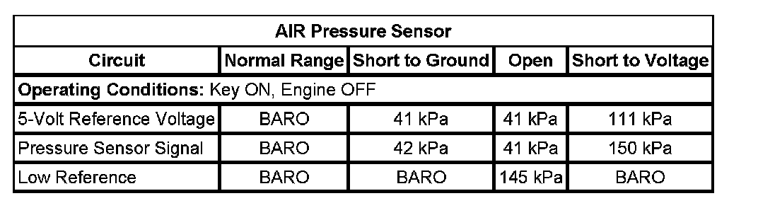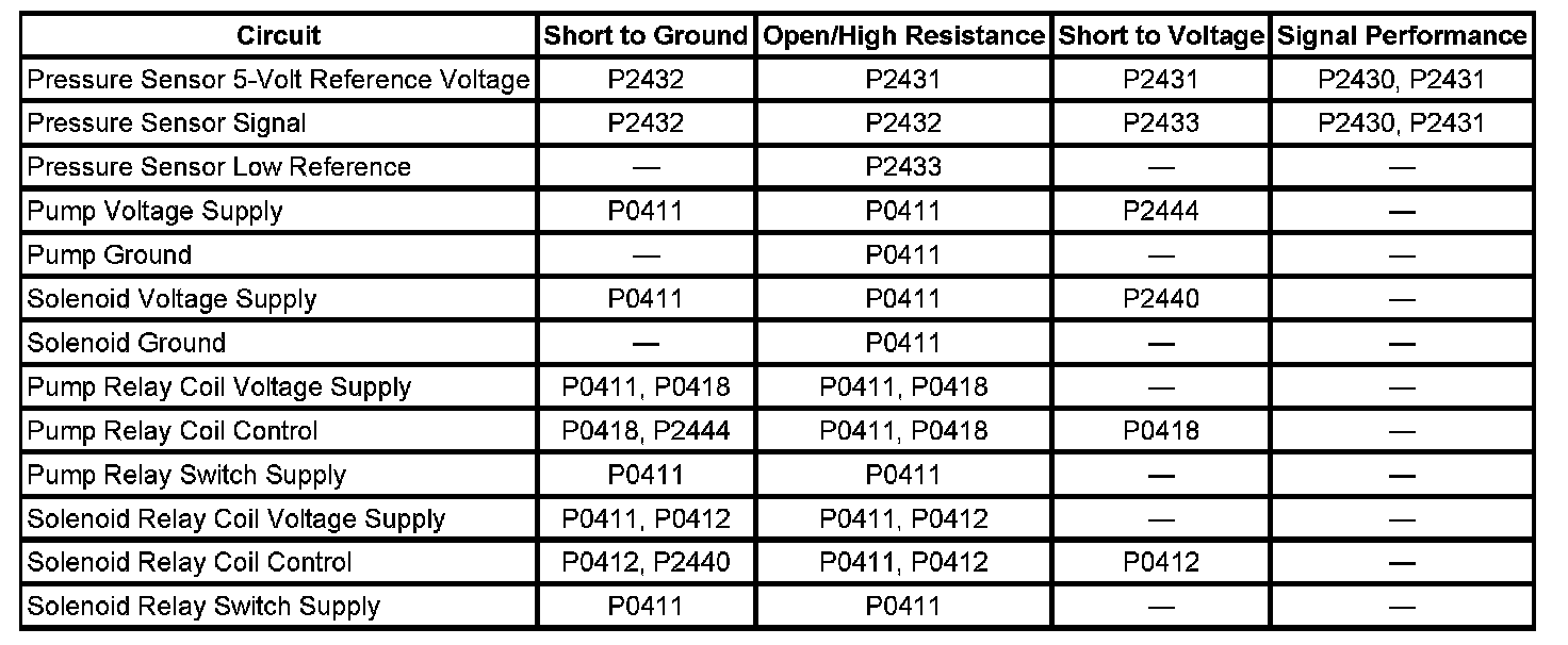 In all 3 phases, testing is accomplished by comparing the measured pressure against the expected pressure. The control module can detect faults in the AIR pump, AIR control solenoid valve/pressure sensor assembly, and the exhaust check valve. The pressure sensor can also detect leaks and restrictions in the secondary AIR system plumbing.