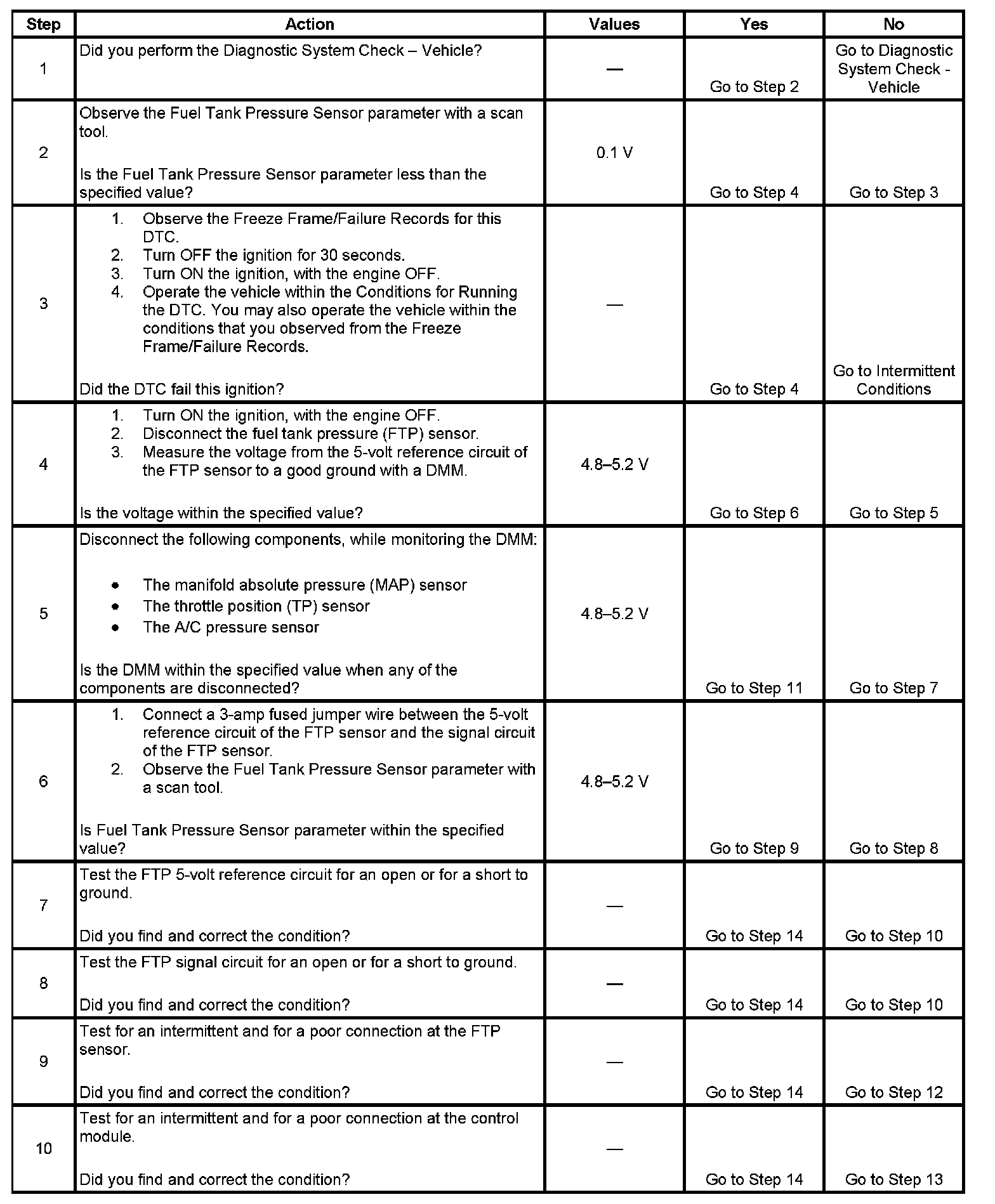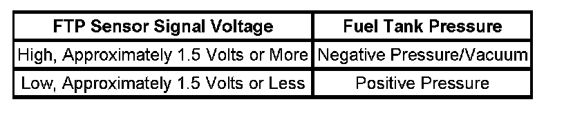 - The fuel tank pressure (FTP) voltage is less than 0.1 volt.