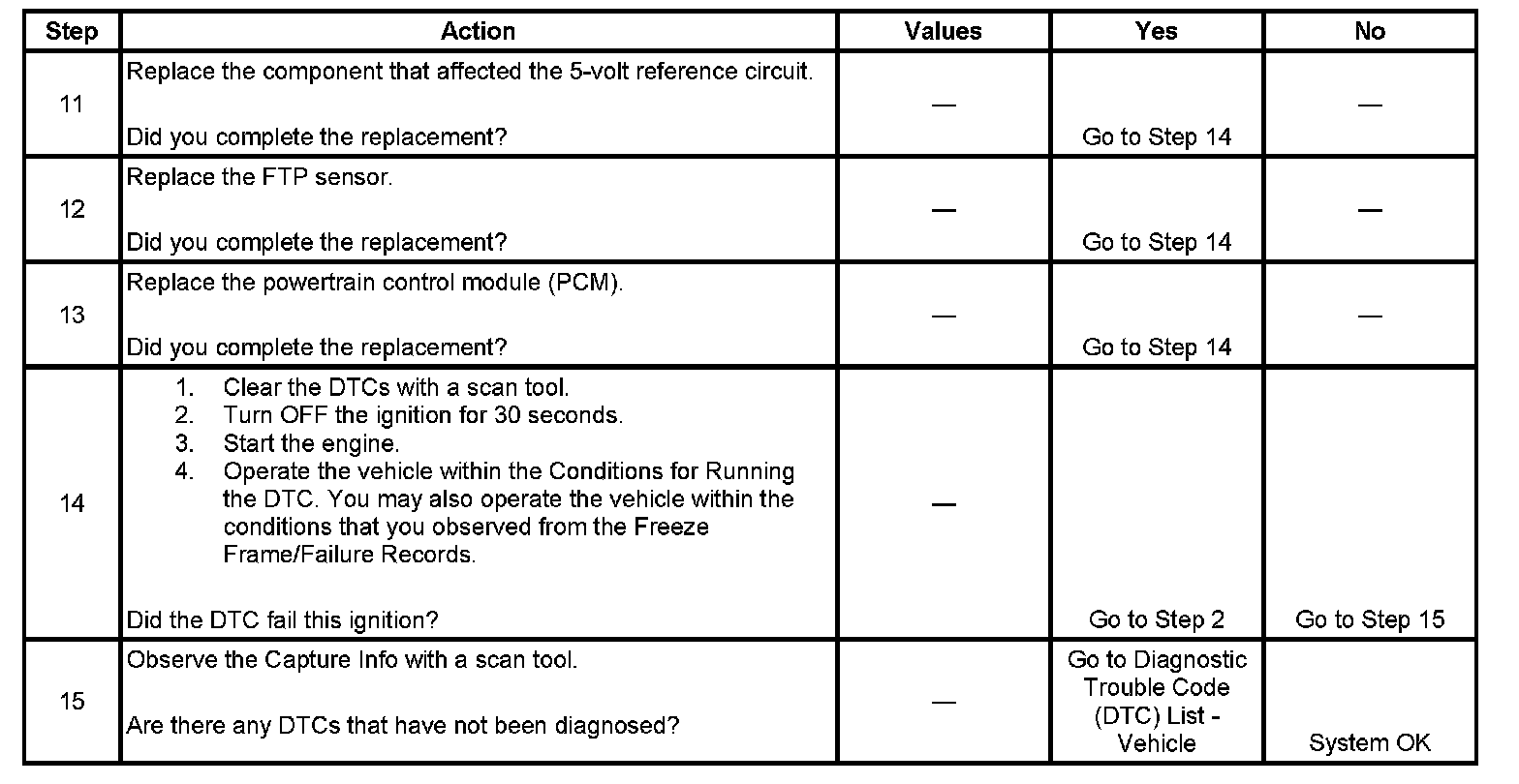 6. If the scan tool displays 5 volts, the FTP sensor signal circuit, the FTP sensor 5-volt reference circuit, and the control module are OK.