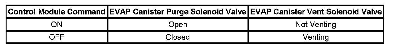 The control module tests the evaporative emission (EVAP) system for a large leak. The control module monitors the fuel tank pressure (FTP) sensor signal to determine the EVAP system vacuum level. When the conditions for running are met, the control module commands the EVAP canister purge solenoid valve OPEN and the EVAP vent solenoid valve CLOSED. This allows engine vacuum to enter the EVAP system. At a calibrated time, or vacuum level, the control module commands the EVAP canister purge solenoid valve closed, sealing the system, and monitors the FTP sensor input in order to determine the EVAP system vacuum level. The following table illustrates the relationship between the ON and OFF states, and the OPEN or CLOSED states of the EVAP canister purge and vent solenoid valves.