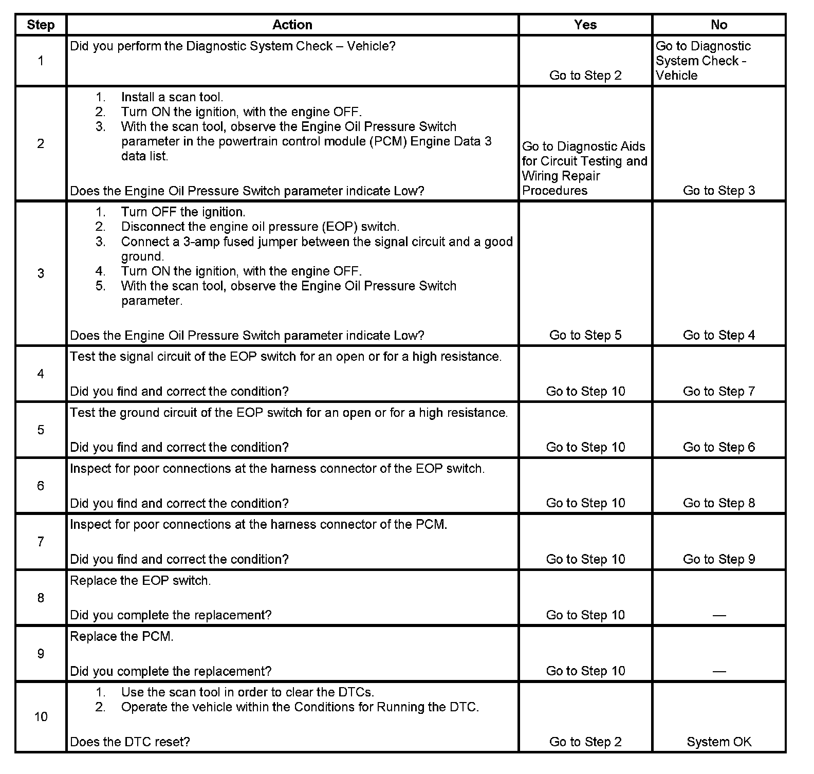 With low oil pressure, the engine oil pressure (EOP) switch closes, and the signal circuit is low. With oil pressure above 4.5 psi, the EOP switch opens, and the signal circuit is high. The powertrain control module (PCM) monitors the oil pressure switch signal circuit, and sends a class 2 message to the instrument panel cluster (IPC), indicating the switch status.