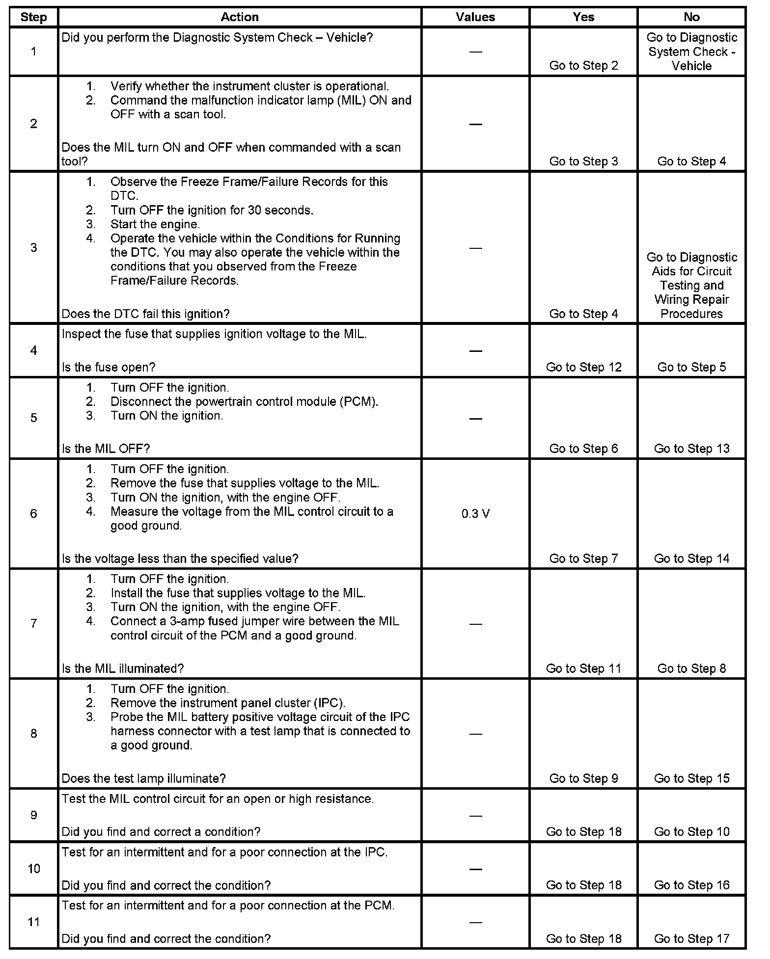 5. This step tests for a short to ground in the MIL control circuit. With the powertrain control module (PCM) disconnected and the ignition ON, the MIL should be OFF.
