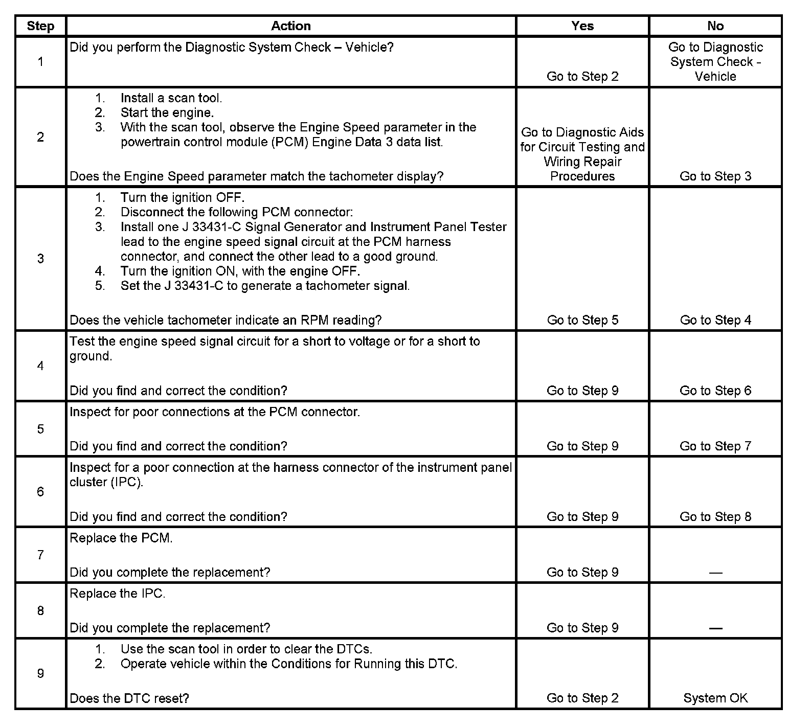 The powertrain control module (PCM) creates the engine speed signal by pulsing the circuit to ground. The PCM monitors the voltage on the engine speed signal circuit. If the PCM determines that the voltage is not within the normal operating range, the PCM sets a DTC.